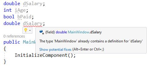 De compiler zal een foutmelding geven zoals hierboven. Om deze foutmelding weer te geven, plaats je de cursor op de locatie waar de foutmelding zich voordoet en dan krijg je de informatie van de fout. In ons voorbeeld is de boodschap dat de variabele dSalary reedt is gedefinieerd in de scope.