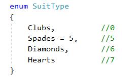 Als we nu de waarde van de enum Diamonds opvragen, dan zal het resultaat 6 zijn. Dit komt doordat we de enum Spades op 5 hebben geplaatst en de volgende items chronologisch oplopen.