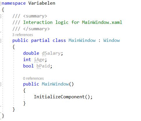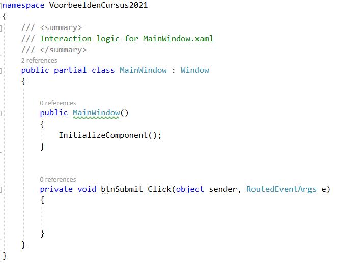 Het niveau van de namespave VoorbeeldenCursus2021 start vanaf het eerste ‘{‘ teken en eindigt met jet laatste ‘}’ teken. In dat niveau zien we een tweede niveau zitten van de partial class MainWindow. Deze start vanaf het tweede ‘{‘ teken en eindigt met het voorlaatste ‘}’ teken.