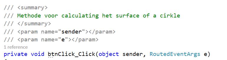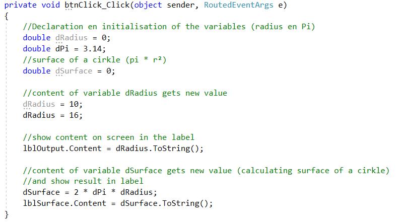 Onze constante variabele PI hebben we in het niveau 2 of de scope van de partial class geplaatst. Op deze manier is de constante dPI in alle inderliggende niveau’s bereikbaar.
