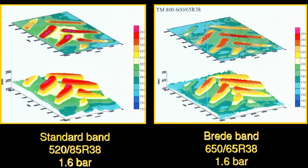 Een lagere bandenspanning geeft een lagere druk op de grond. Bij brede banden en bij rupsentrekkers en kooiwielen is bij dezelfde belasting de druk op de grond kleiner dan bij smalle banden. Het gewicht wordt daar immers over een groter oppervlak verdeeld. Vele testen toonden aan dat rijden op een juiste (lagere) bandenspanning leidt tot minder insporing, minder wielslip, meer trekkracht en lager verbruik aan brandstof. Het beste is om met minder dan 1 bar bandendruk het perceel te bewerken.