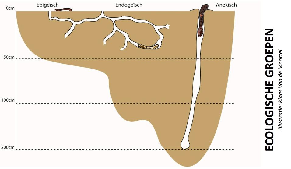 ü Je kent de drie ecologische groepen van de regenwormen.