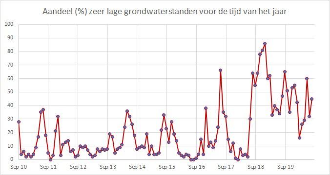 De laatste jaren is het aandeel van zeer lage freatische grondwaterstanden vaak erg hoog. Percentages boven de 40%, 50% of zelfs hoger zijn de laatste jaren vaak bereikt. Sinds 2017 zien we veel vaker hoge percentages zeer lage grondwaterstanden. De 16 hoogste waarden vinden we allemaal in de laatste drie jaar. Sinds juni 2018 zien we bovendien geen percentages meer onder de 15% terwijl voordien het merendeel van de maanden een waarde onder de 15% had (Huysmans, 2020a).