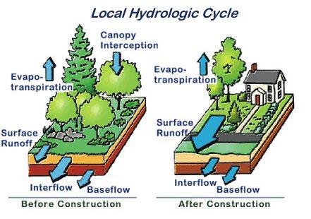De natuurlijke hydrologische cyclus zal onder invloed van urbanisatie wijzigingen vertonen in neerslag (precipitatie) en verdamping (evaporatie). Dit staat ondermeer in verband met het urban heat island (stedelijk warmte eiland) effect. Het urban heat island effect duidt op het karakteristieke warmtepatroon dat een stedelijke nederzetting vertoont in vergelijking met het omgevende platteland en werd reeds in de vroege 19de eeuw wetenschappelijk beschreven door de meteoroloog Howard (1818-1820). Steden vertonen een temperatuur die gemiddeld 5 à 10°C hoger ligt dan het omringende platteland. Dit komt doordat steden, opgetrokken uit beton, baksteen