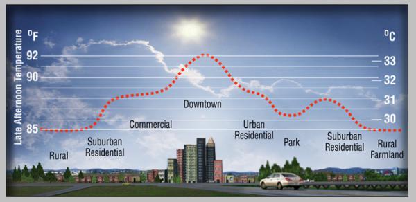 en andere materialen die makkelijk warmte absorberen, sneller opwarmen en die warmte ook trager terug afgeven, dan rurale oppervlakten, waar planten via o.a. bladreflectie en evapotranspiratie de temperatuurvariaties meer matigen In dit warmere stedelijk microklimaat zullen bodems en andere oppervlakten meer water verdampen, en ook planten en bomen zullen meer transpireren om hun temperatuur onder controle te houden en in hun vochtbehoefte te voldoen. Verder is aangetoond dat ter hoogte van grote steden de neerslaghoeveelheid gemiddeld lager is dan in het omliggende platteland, waar de koelere lucht gaat condenseren en sneller aanleiding geeft tot neerslagvorming dan boven de warmere stad.