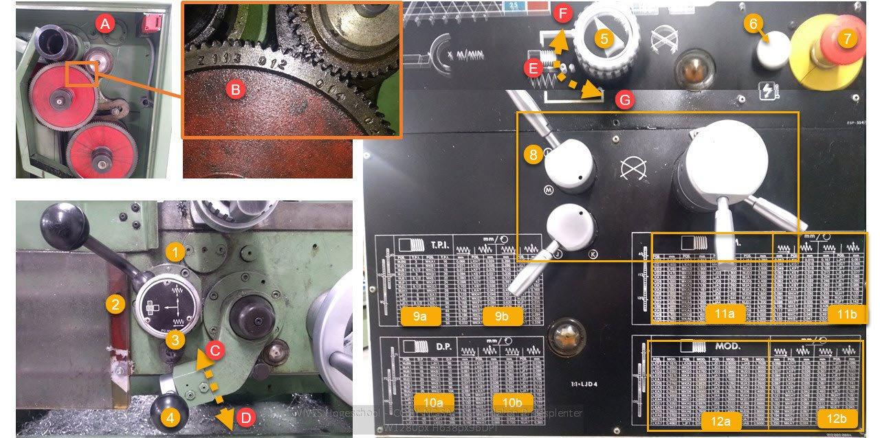 De tandwielcombinatie om metrische schroefdraad te snijden (bij de Nardini draaibanken is dit 40, 113 en 120 tanden) is gemonteerd in de draaibank. Dit bepaalt dat spoed/voedingen/ worden dienen worden afgelezen op de tabel aangegeven met M.M.