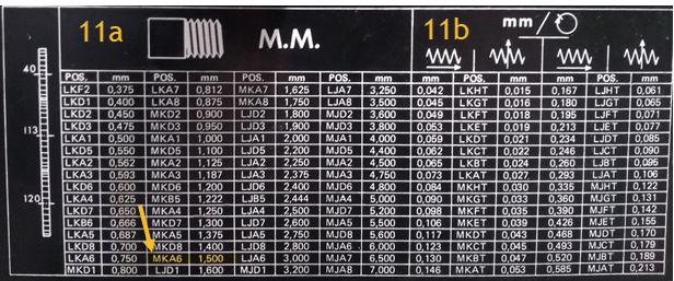 Spoed wordt ingesteld door een combinatie van letters en cijfers (bv. een spoed van 0,375 mm met combinatie LKF2)