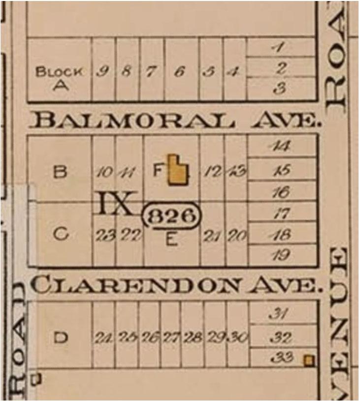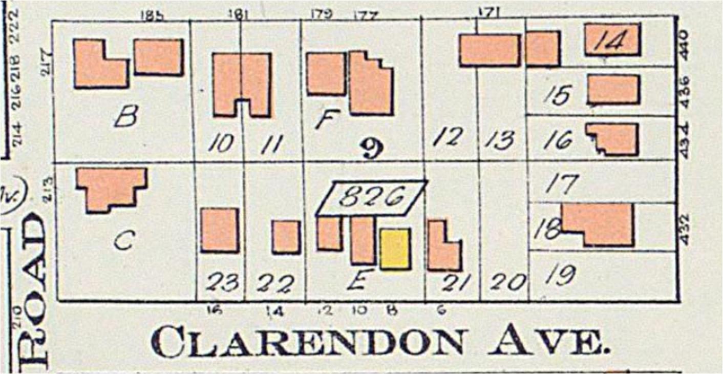 BOTTOM LEFT: Charles E. Goad’s 1910 Atlas of the City of Toronto showing the newly built 16 Clarendon in lot 23 as well as Dyce Saunders’s 213 Poplar Plains house in Block C.