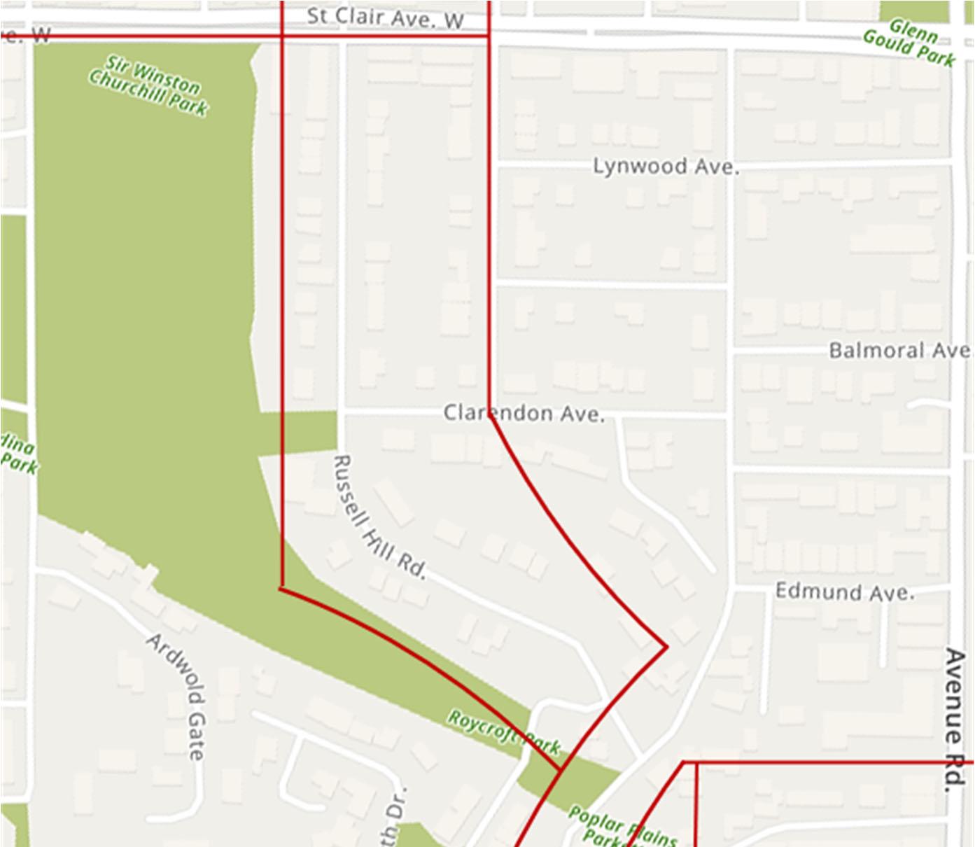 Following annexation, established place names such as Wychwood Park, Forest Hill and Deer Park remained in use but the area bounded by these three localities continued to lack a distinctive identity. By the 1950s even historic neighbourhood names had fallen out of use among Torontoni‐ans. It was not until the 1980s that old names were resurrected and new ones invented, primarily by real estate agents employing them as a market‐ing tool. One of those new labels was South Hill, presumably named for its location at the southern edge of the escarpment. The area’s boundaries were formalized in 1997’s Your Guide to Toronto Neighbourhoods as being from Spadina Road to Avenue Road and St. Clair Avenue to roughly Poplar Plains Crescent. In 2001 the city issued its own official neighbourhood designations which incorporated the district under the wider Casa Loma umbrella. However, the South Hill moniker remained, reinforced by the 2009 addition of Toronto neighbourhood profiles to Wikipedia based primarily on the Guide. A notable variation was the online profile’s exten‐sion of the neighbourhood’s southern boundary to the CPR tracks.