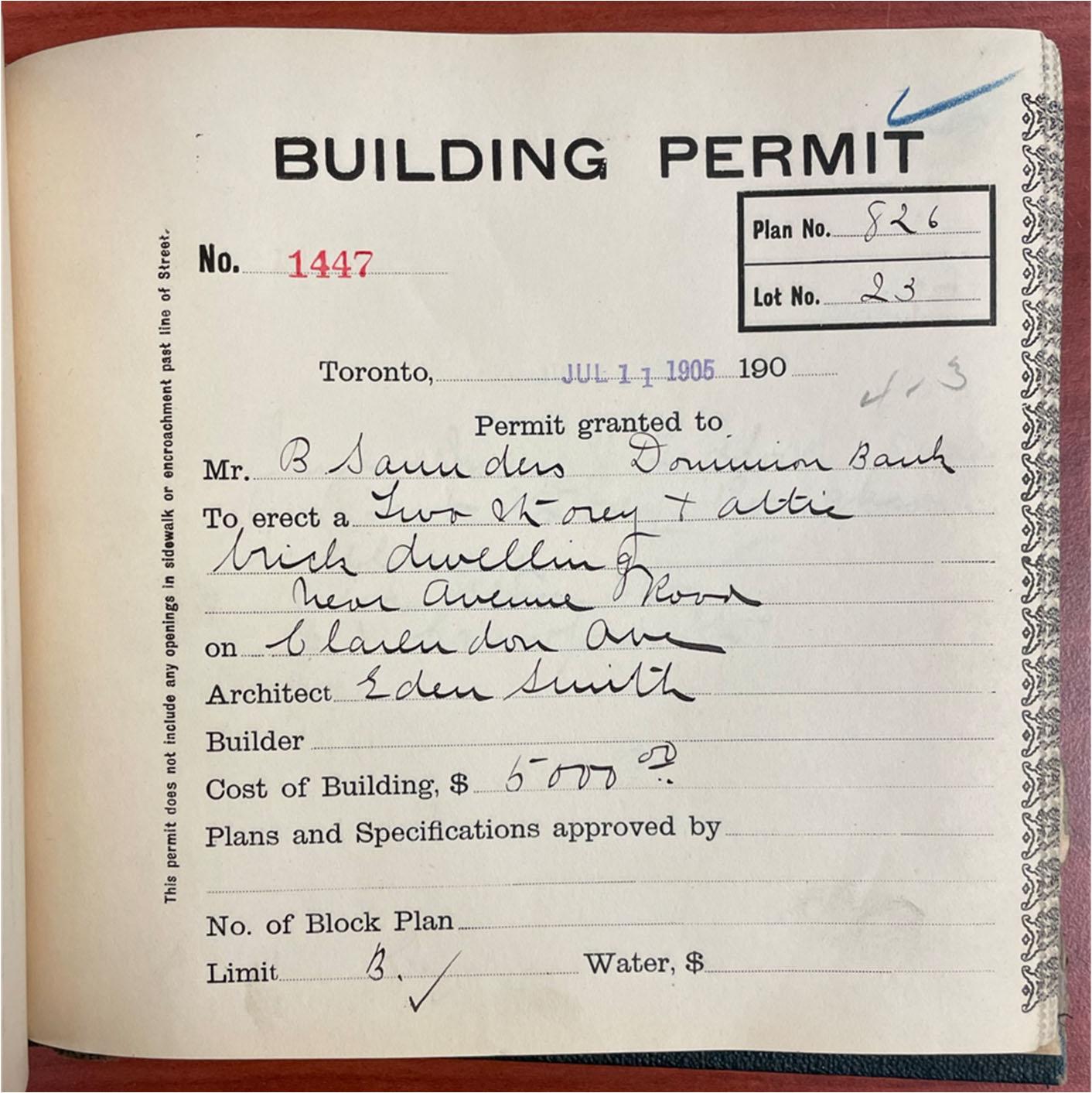 TOP LEFT: The original building permit stub for 16 Clarendon Ave. identifies the property by its legal designation as Lot no. 23 in subdivision Plan no. 826 as seen below. In actual fact, it also initially included the western 15 feet of Lot 22. (Toronto Archives)