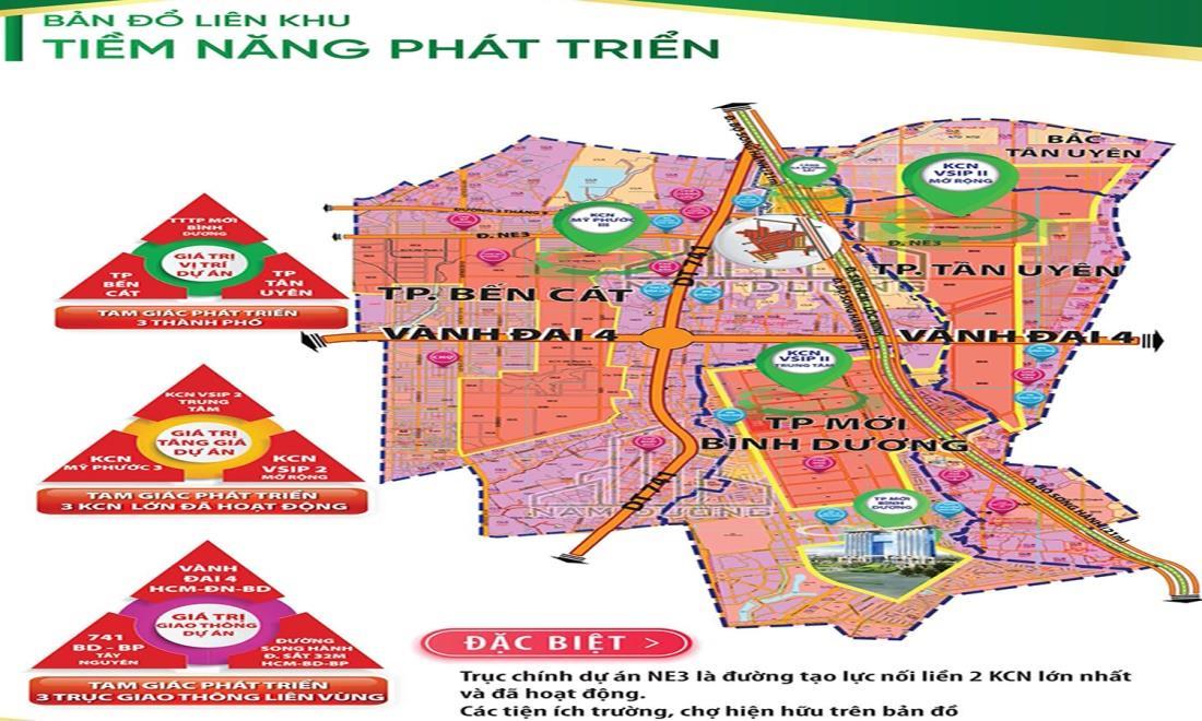 Đại học Cổng Xanh 600 ha, BVĐK Mỹ Phước, BVĐK Bình Dương, sân golf Twin Doves, AEON Mall và đặc biệt là trung tâm thương mại thế giới