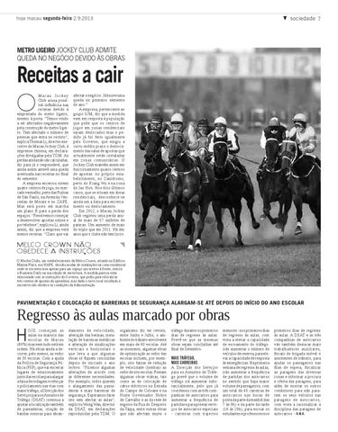 afectar o negócio. Já houve uma queda no primeiro semestre do ano.” A empresa, pertencente ao grupo SJM, diz que a medida vem em resposta à população que pede que os centros de jogos em zonas residenciais sejam deslocados mas o pedido já foi feito igualmente pelo Governo, que exigiu a curto-médio prazo o deslocamento das salas de apostas que actualmente estão instaladas em zonas comunitárias. O Jockey Club mantém assim em funcionamento quatro centros de apostas: no próprio estabelecimento, no Canídromo, perto do Kiang Wu e na zona do Iao Hon. Nos dois últimos casos, que se situam em áreas residenciais, desconhece-se ainda um a data para encerramento ou deslocamento. Em 2012, o Macau Jockey Club registou uma perda anual de mais de 57 milhões de patacas. Um aumento de mais do triplo que em 2011. Há dez anos que o clube não tem lucro.