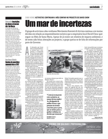 local, mas preferia que as mesmas tivessem o cunho da população. “O projecto foi contestado por nós porque acreditamos que o Governo deveria dar um destino mais sustentável para o ilhéu que tem uma grande importância para os cabo-verdianos. Poderiam ser realizada obras, mas estas deveriam ao menos partir do próprio Governo, com propostas dos cidadãos e com construções mais simples e sustentáveis que respeitavam a dinâmica, a cultura e o ambiente da nossa cidade.” Os três vectores O grupo Movimentu Korrenti di Ativista considera que o investimento de David Chow é como lançar uma moeda ao ar sem saber qual dos lados vai cair no chão. “O Governo e a autarquia estão a pensar que a moeda vai cair da maneira que estão a pensar. Mas de onde vem esta certeza? E se der tudo ao contrário? Será que estes governantes estão preparados para assumir esta responsabilidade?”, questionou o representante do grupo. Tal como já tinha sido noticiado, os activistas alertam para a possibilidade do empreendimento de David Chow poder atrair mais prostituição e casos de branqueamento de capitais. “Aos cabo-verdianos que consideraram esta uma boa decisão, devem estar atentos a três dados: a questão do tráfico de drogas, prostituição e lavagem de capital.” Há também o receio de se gerarem situações de desigualdade ou mesmo exclusão social. “Eles devem pensar [se o projecto] abre a porta para a possibilidade de transformação destas ilhas num paraíso fiscal no continente africano”, rematou o grupo. Andreia Sofia Silva