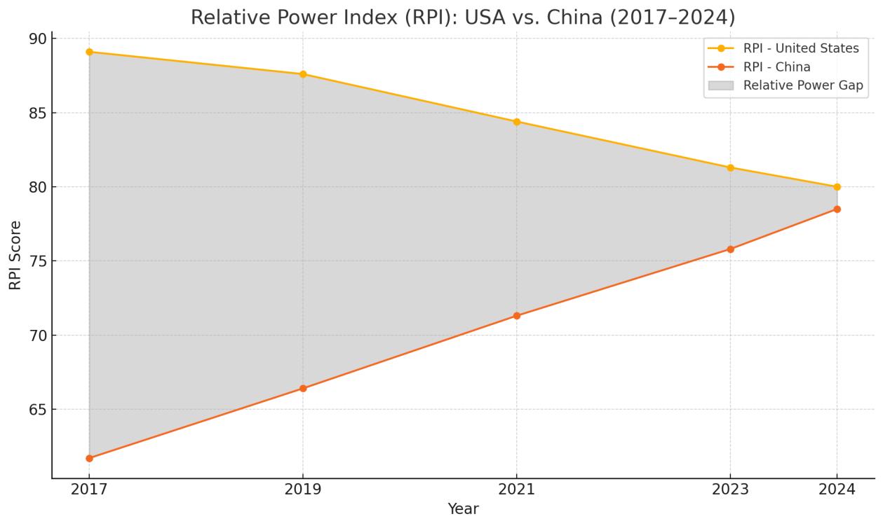 Figure 7: Relative Power Index (RPI), USA vs. China (2015–2024)