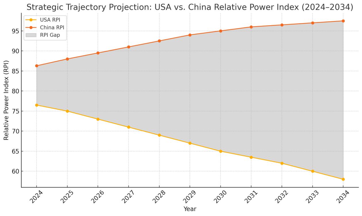 The projected trajectory of the Relative International Power (RIP) Index between 2024 and 2035 reveals a sobering and unavoidable truth: the United States is experiencing a steady, structural decline in its ability to lead the international system alone. Meanwhile, China is consolidating its position and preparing to assume, de facto, the role of the dominant global actor across strategic domains.