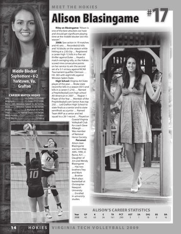 Riley on Blasingame: “Alison is one of the best attackers we have and should get significant playing time at the middle blocker slot this season.” 2008: Saw action in 19 matches and 45 sets … Recorded 63 kills and 16 blocks on the season while hitting at a .230 clip … Registered a career-high 12 kills in a five-set thriller against Duke … Keyed a match-swinging rally, as the Hokies scored nine consecutive points on her service to win the second set of a 3-1 victory against NCAA Tournament qualifier Clemson … Hit .583 with eight kills against Winston-Salem State. High School: Virginia AA State player of the year … Broke state record for kills in a season (501) and kills in a career (1,216) … Named a PrepVolleyball.com high school All-American in 2007 … Region 1 Player of the Year … Member of the PrepVolleyball.com Senior Aces top 250 … Led Grafton High School to state finals as a senior and to state semifinals as a junior … Named Team MVP as a senior and led squad to a 28-1 record … Played on Coastal Virginia Volleyball Club for coach Dave Albaugh … Was member of National Honor Society. Personal: Alison Jean Blasingame was born May 30th, 1990, in Rome, N.Y. … Daughter of Jim and Wendy Blasingame … Has two brothers Trey and Mark … Brother Mark plays basketball at Christopher Newport University … Enrolled in university studies.