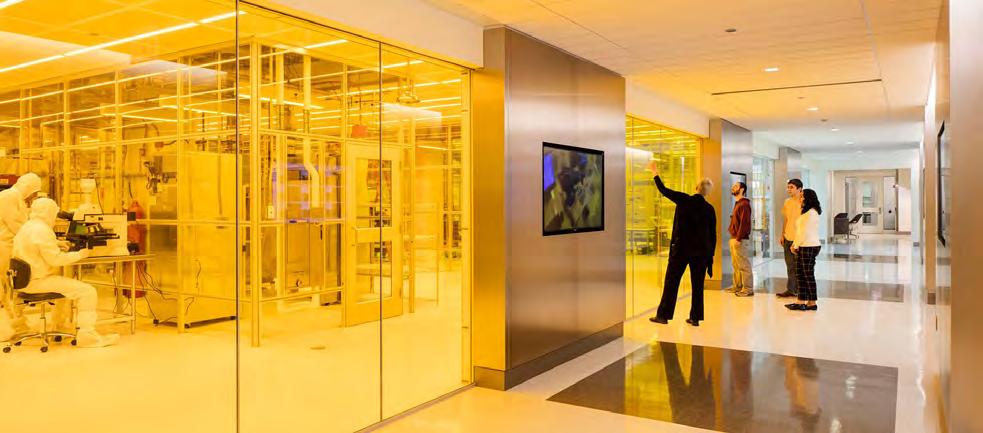 The Eckhardt Center has two levels of high-performance research facilities located below grade to isolate the laboratories from vibration and electromagnetic interference. A 10,000-square foot Class 100 clean room, an imaging suite for electron microscopes and a number of optics labs designed to meet stringent temperature and humidity criteria are included.