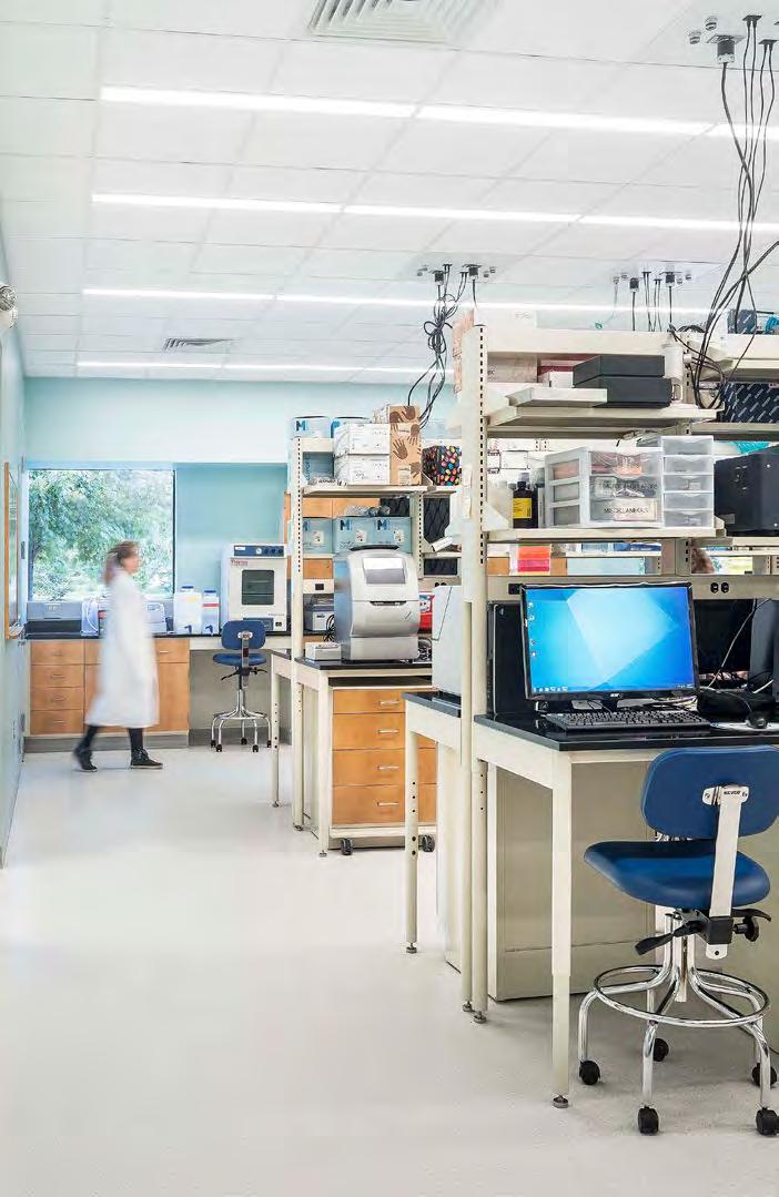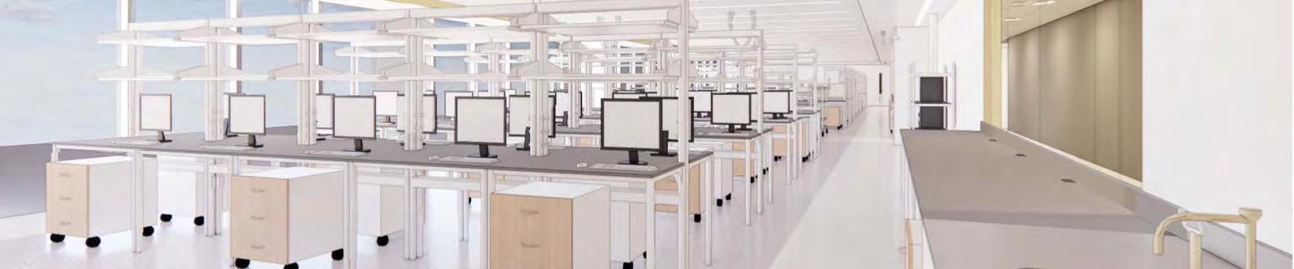 Prefabricated offsite construction offered a great solution and the team determined that the 44 tissue culture and dedicated support lab rooms could be replicated and constructed in a modular fashion using offsite construction. These support labs can physically slide in and be stacked into place behind the open labs and plugged into services on installation.