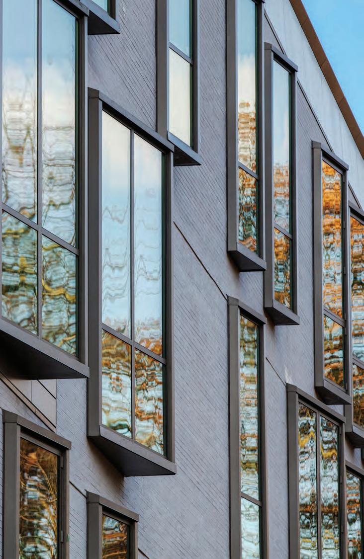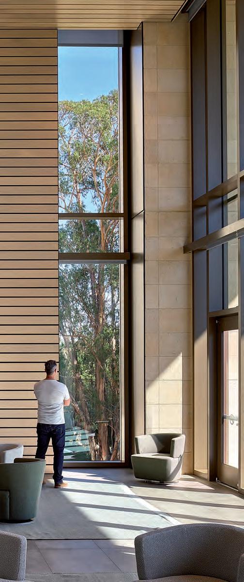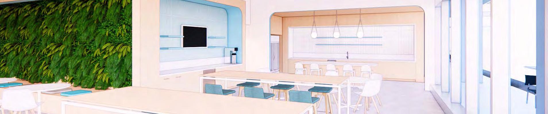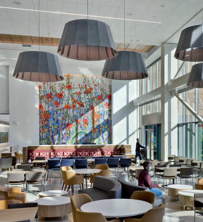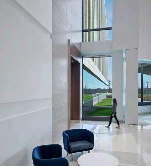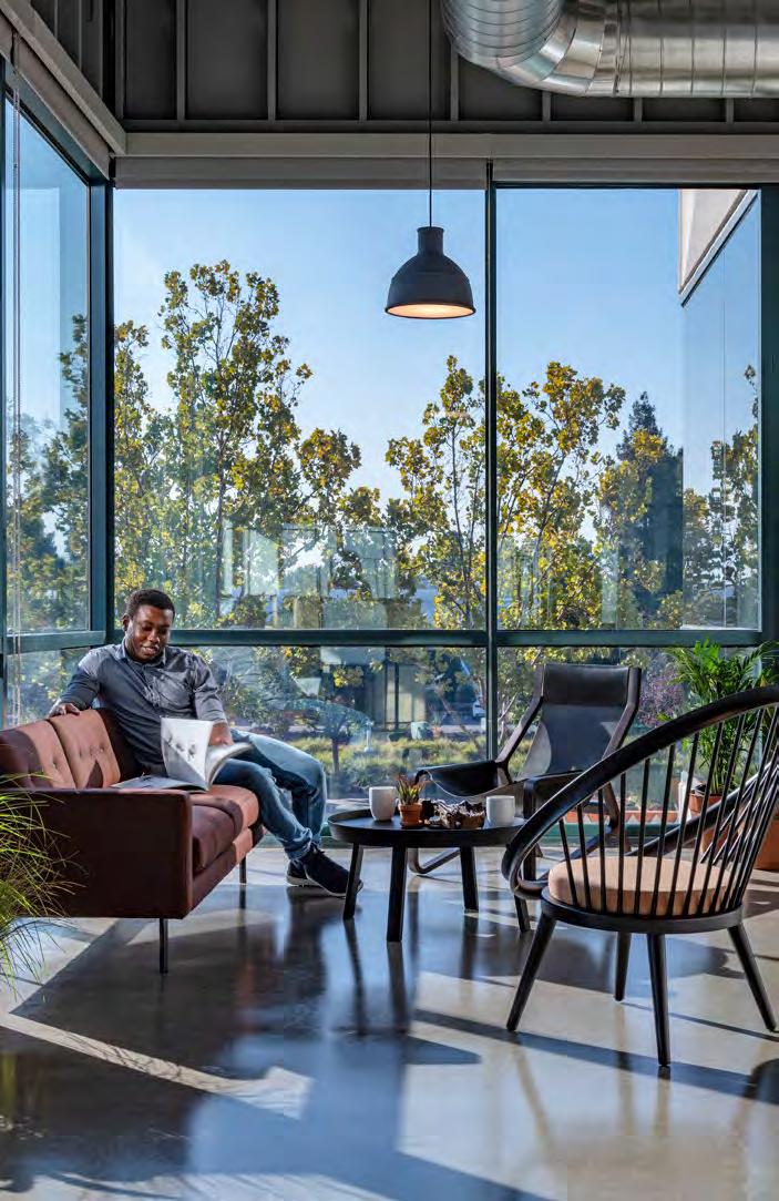 optimistic and confident. The design uses variety and natural materials and colors to create places for people to gather. Select digital experiences are integrated throughout so the company can tell its story to clients, investors and recruits.