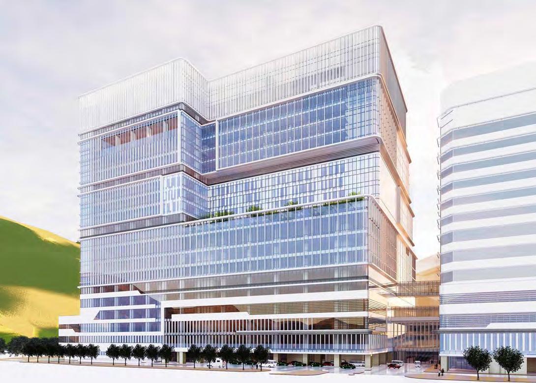 Additional features include an on-grade helipad, a Central Energy Plant located on the north of the complex, a loading/receiving facility integrated into the hospital on the northeast and utility elements such as cooling towers, oxygen storage and generator fuel tanks.