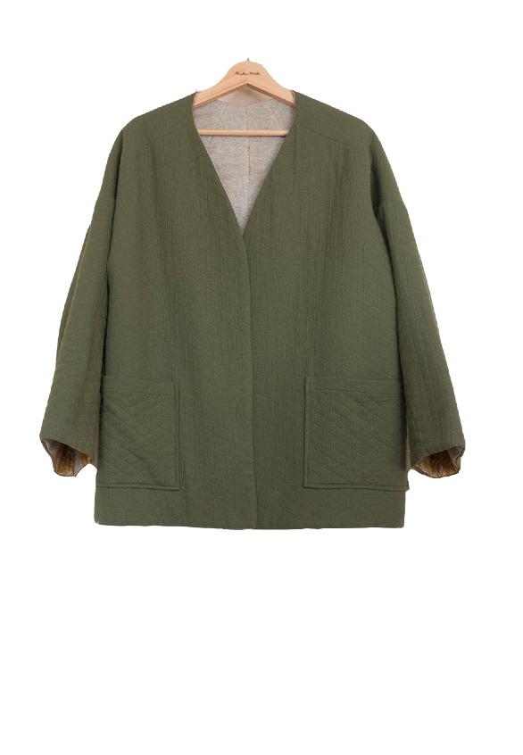 Chaqueta amplia de manga caída, bolsillos delanteros y cerrada con tres botones. Costuras rematadas con bies.