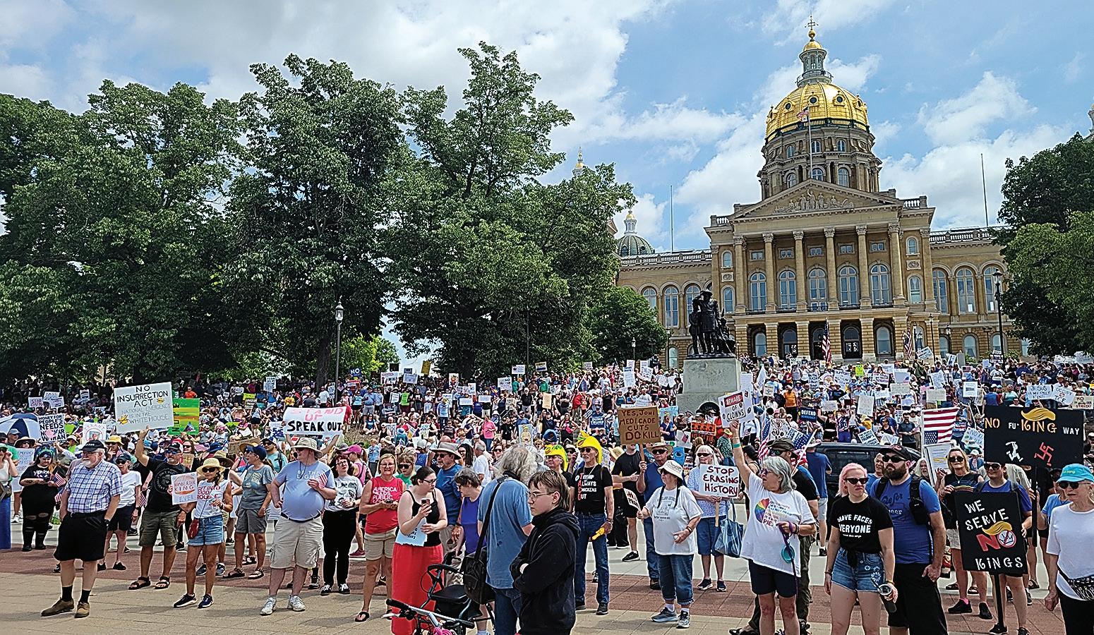 Miles de personas inundaron las escalinatas del Capitolio de Iowa el sábado para protestar contra el presidente Donald Trump, cuyas acciones dijeron que están dañando a la nación y girando hacia la tiranía.