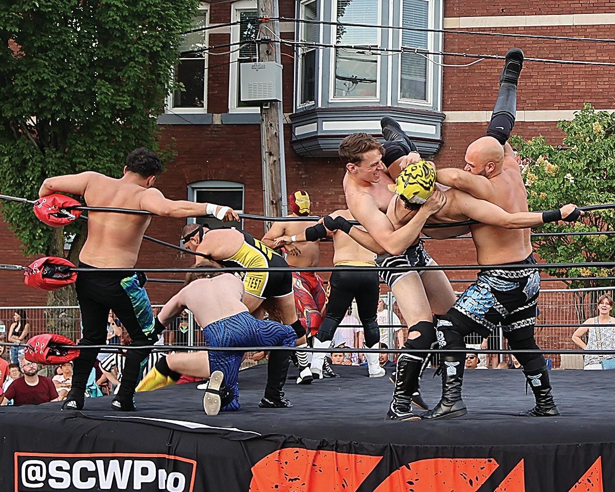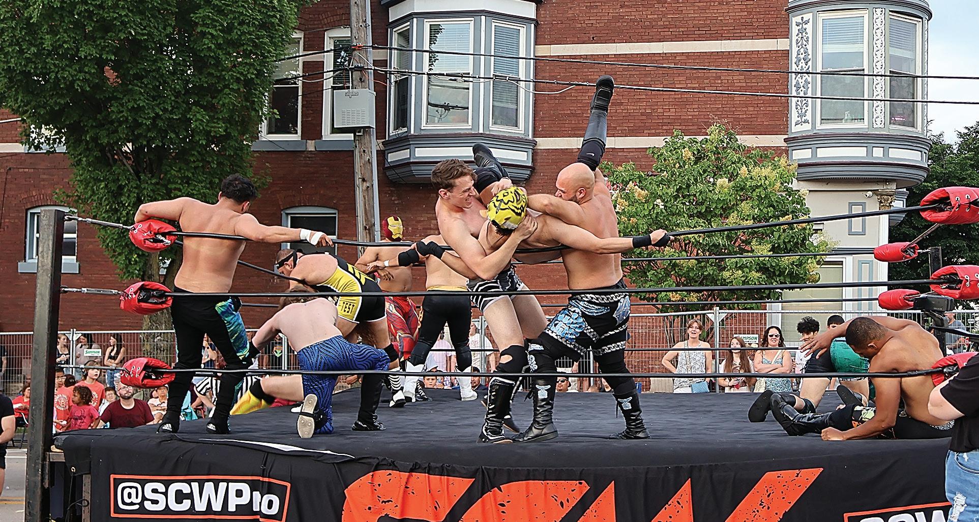 Moline, IL- La noche del viernes 14 de junio Mercado on Fifth presentó Lucha Libre Legacy. Por cuarto verano consecutivo, Ascentra Credit Union patrocinó una noche de acción de SCW Pro que reunió a familias de todo Quad Cities al icónico vecindario Floreciente en Moline. La novedad de este año fue “La Batalla por el Campeonato de Mercado”, una Batalla Campal en la que una docena de competidores lucharon por el primer “Campeón de Mercado”. El ganador de la Batalla Campal fue “Corn Boi” Kevin Gutiérrez, quien recibió un nuevo y hermoso cinturón de campeonato hecho exclusivamente para Mercado en Fifth.