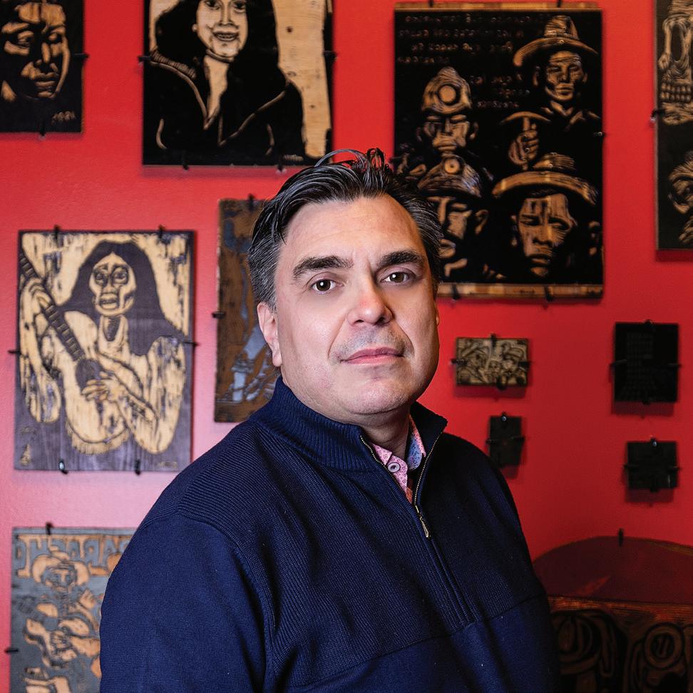 casa”, dice sobre la gente de la comunidad que viene en busca de una conexión con sus raíces. Incluso para él, dice, “el museo siempre fue como una iglesia, un lugar privado, donde podía tener un momento para sí mismo”. Pero el museo por sí solo no se define sólo por lo que se encuentra en su interior, sino también por lo que lo rodea. El NMMA está en el corazón de Pilsen, enclavado en un barrio residencial donde la gente vive y cría a sus hijos. Es un lugar donde las familias trabajan duro para llegar a fin de mes. También están los enamorados de la cultura latina, los intrigados por los coloridos pasajes y edificios con sus murales más grandes que la vida real que representan escenas de la vida y la historia de Chicago. También están las figuras importantes de la cultura latina que han allanado el camino a tantos que han visitado el NMMA, como Dolores Huerta, César Chávez y Sandra Cisneros. El museo es el lugar de paso de aquellos que han dejado indeleblemente su huella en la arena para las generaciones futuras. Ochoa comparte que su primera tarea como presidente es seguir fomentando esas relaciones y establecer contactos con las principales regiones de todo el país para poner a la NMMA en el mapa a una escala aún mayor. Lo ha estado asimilando todo, internamente, observando y escuchando. Con todo, también quiere preservar los pilares sagrados establecidos por su predecesor, hacer que el museo sea siempre gratuito para todos, y mantener su compromiso con la educación.