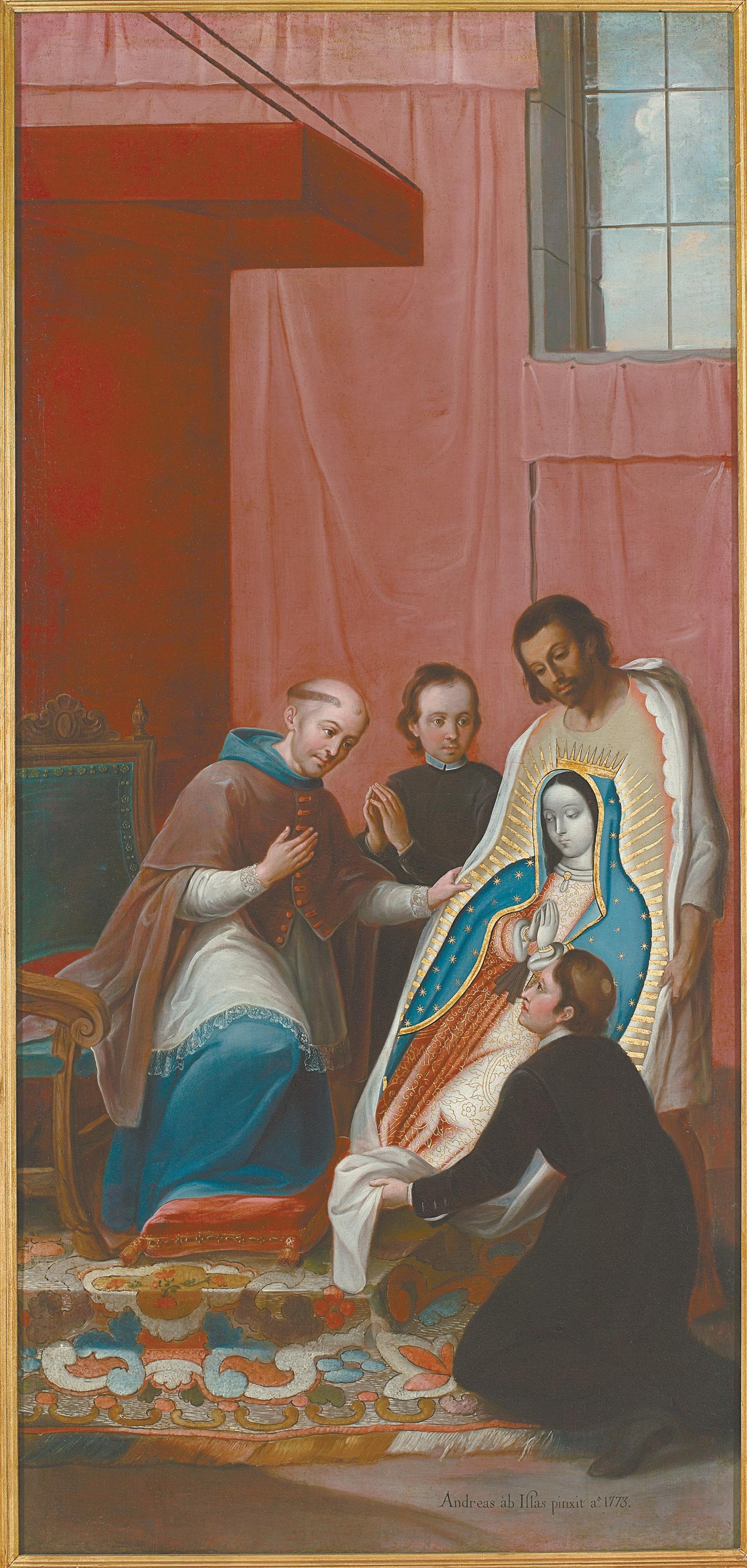er paintings of Saint Juan Diego painted by Spanish artists, which depict him with strong European features. The dark colors around the main image contrast the much brighter colors on Our Lady of Guadalupe and become the focal point that draws our attention. The Bishop’s image is also pow erful, particularly the angle of his hand in the painting. The crown on Our Lady of Guadalupe represents that she is the queen of all that is created. The crown is not on the original image of Our Lady of Guada lupe but it is a unique trait to this painting. What makes the image of Our Lady of Guadalupe so unique is that she is a mix of both Spanish and indigenous features, showing a sense of unity among both cultures. The artist, Andres de Islas was known for nonreligious images of people, his paintings portrayed the divisions and racial mixtures of colonial Mexico.