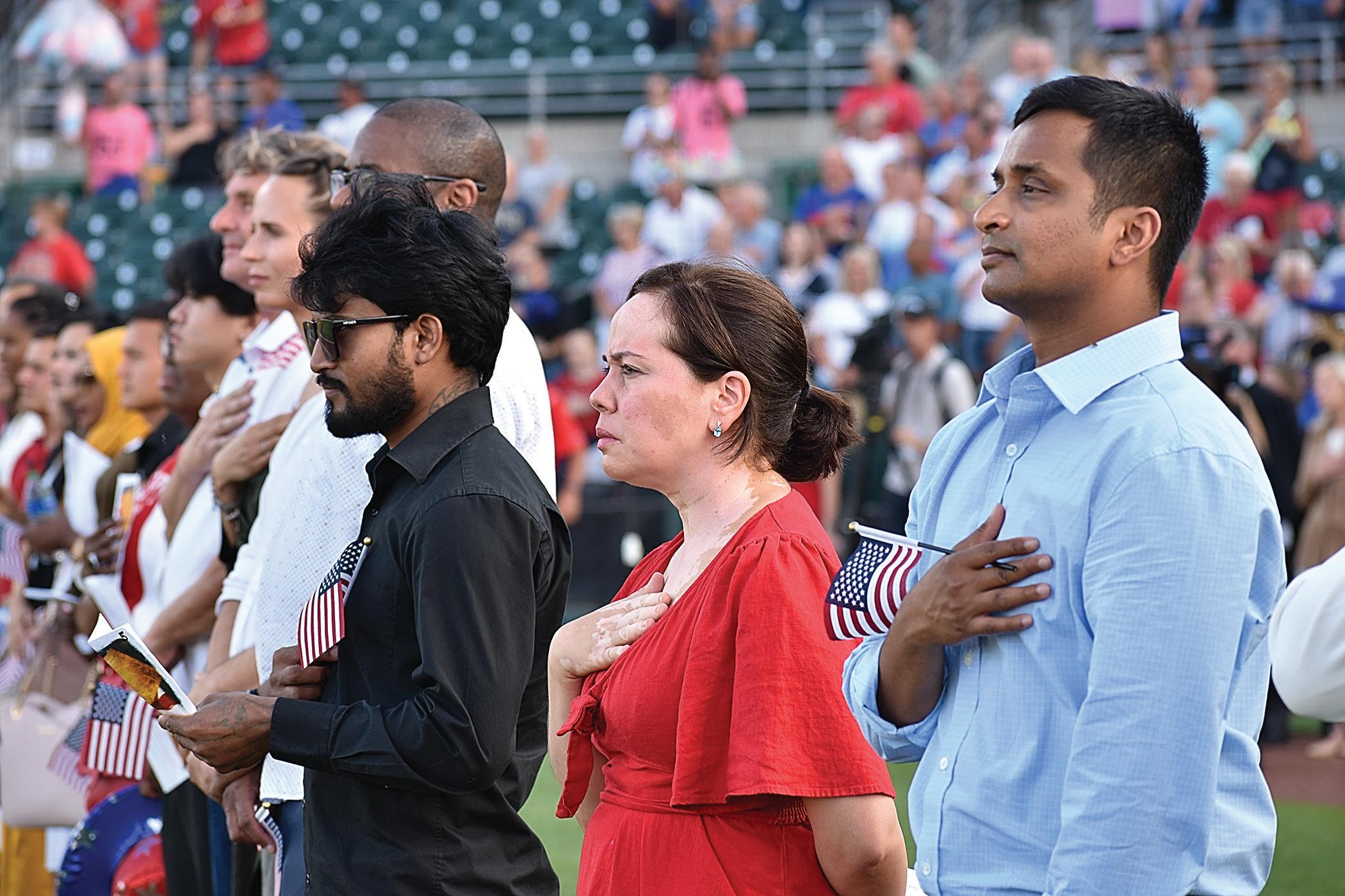 The ceremonial first pitch was thrown by one of America’s newest citizens, Maw Naing Oo, from Thailand, who was among the 32 new citizens at Principal Park.