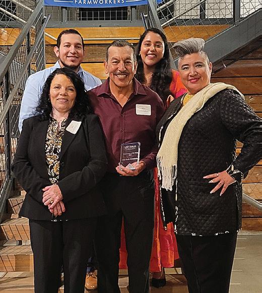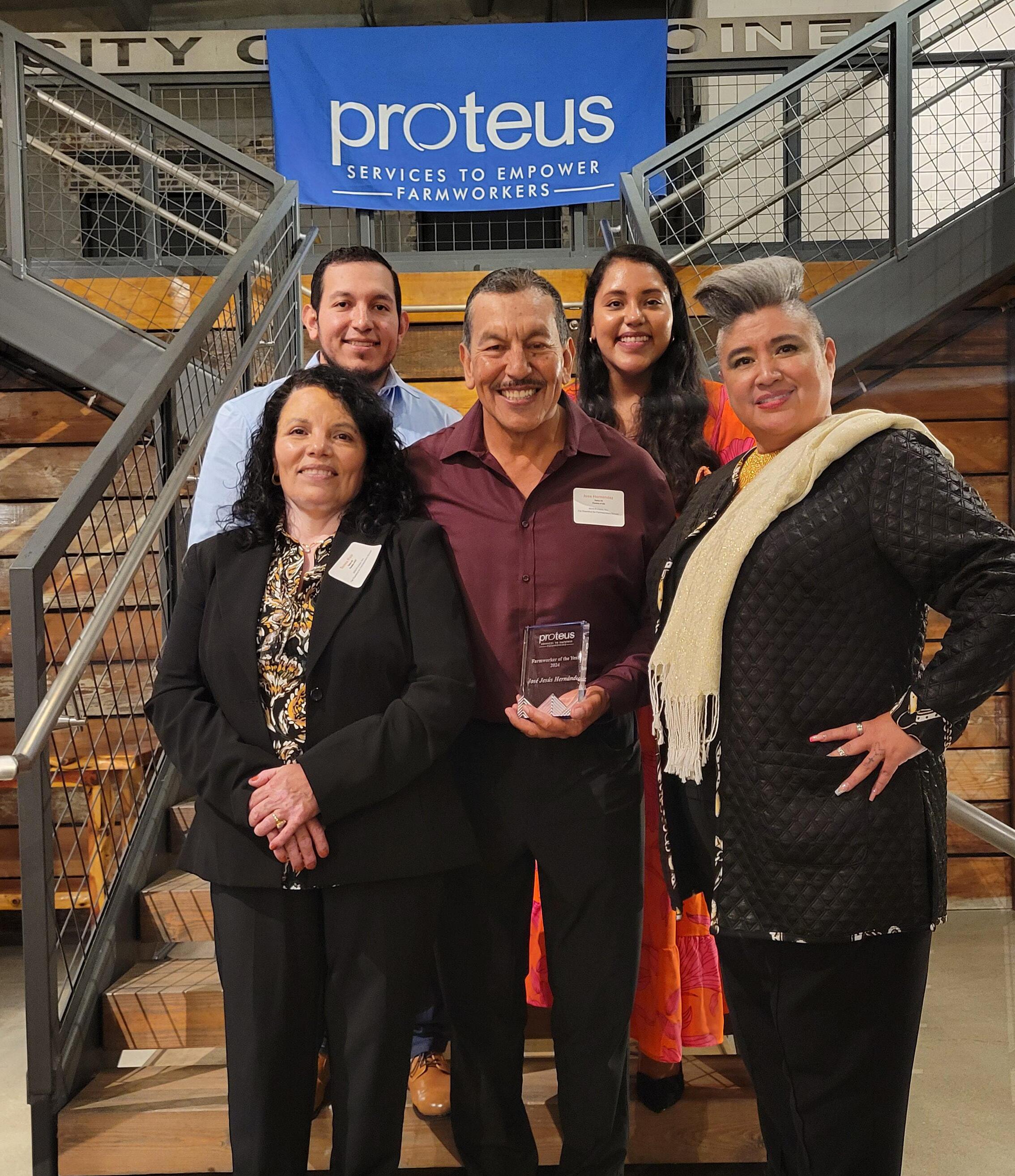 José Jesús Hernández receiving the farmworker of the year award by Proteus Inc he is pictured with his family and with Proteus Inc CEO Daniel Zinnel.