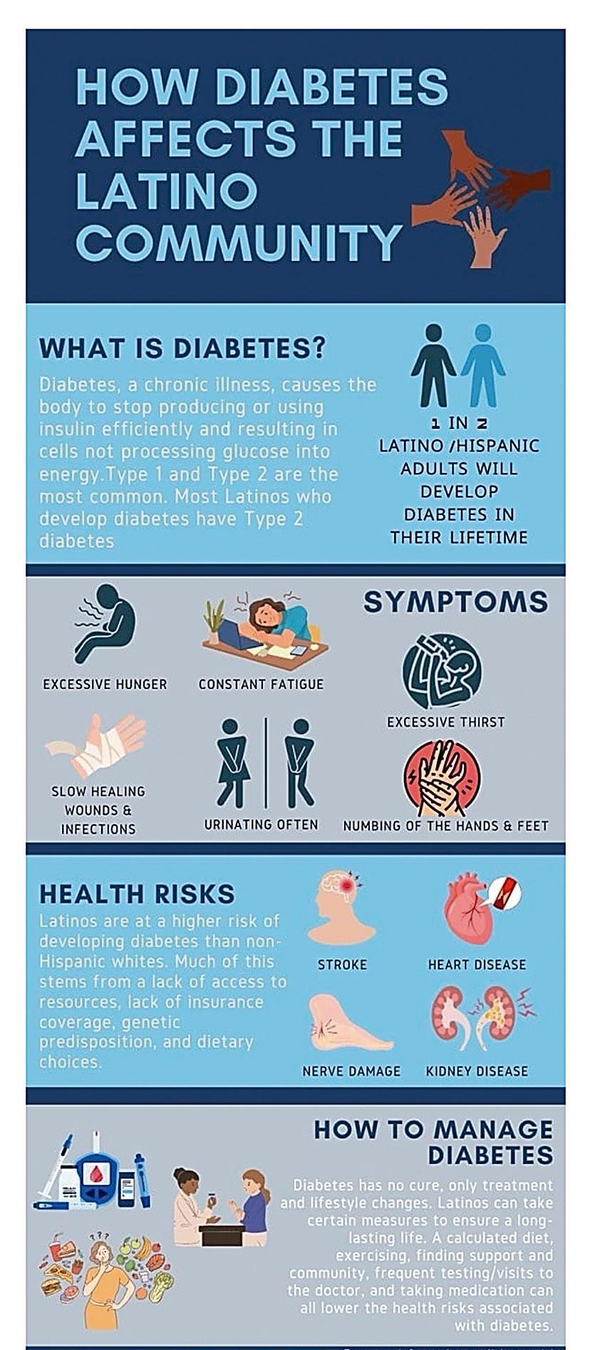 Get screened every three years if over 45 or with risk factors; ask for a blood glucose or A1C test. Healthy options are part of the Latino culture, like eating beans, vegetables, herbs, fiber-rich grains, and salsas. The libraries have several cookbooks tailored to diabetic diets, so you can adjust traditional recipes based on diabetic guidelines and eliminate sugar and fried food. Exercise is key. Even a 30-minute walk can make a difference when practiced at least 5 days a week.