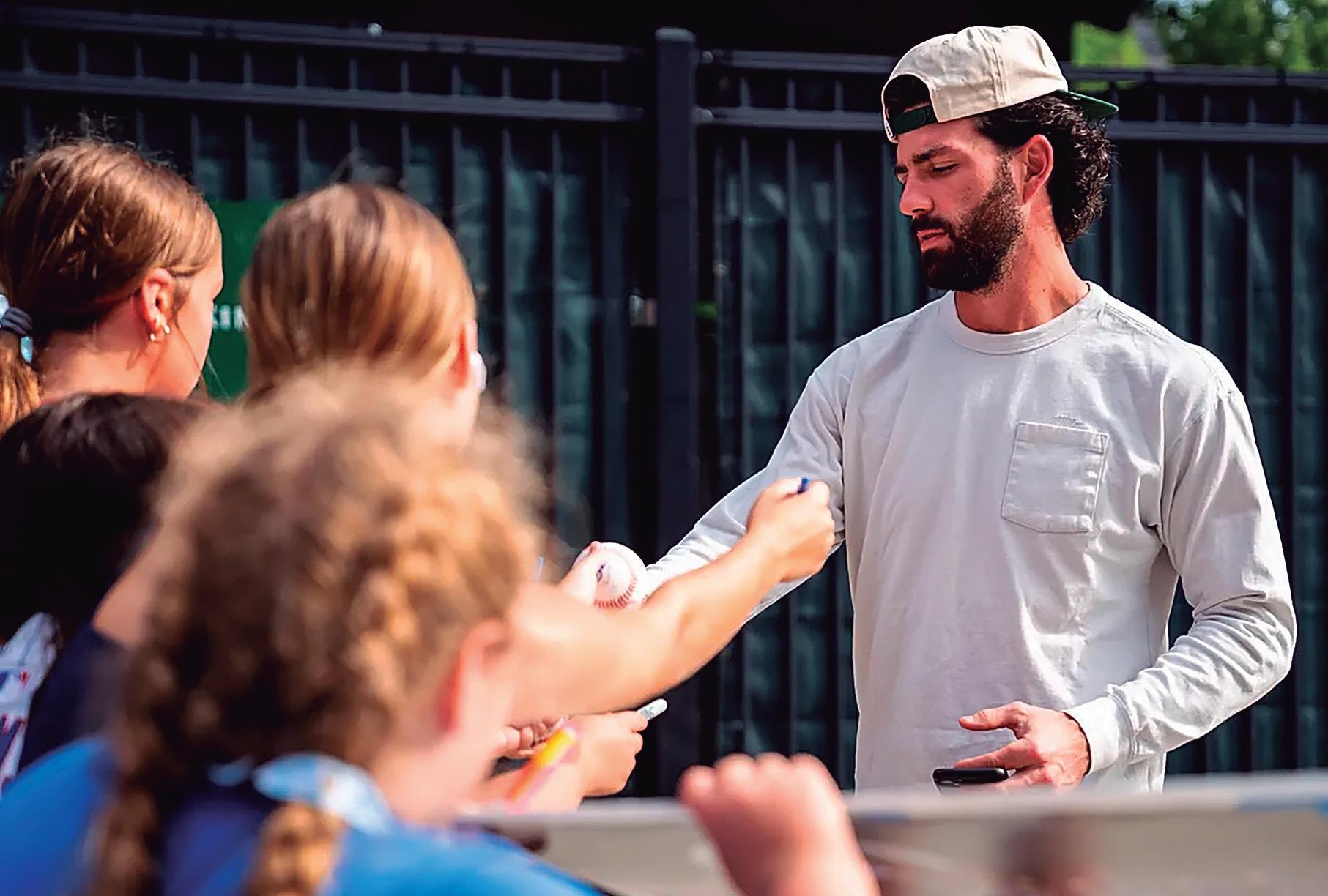 Cubs shortstop Dansby Swanson signs autographs for young fans on Aug. 17, 2025, outside Wrigley Field. Swanson routinely wears a blue ‘Team Ryker’ bracelet in support of Ryker Colon, of Muscatine, who is diagnosed with a rare form of muscular dystrophy.