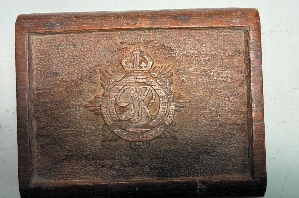These photos were taken by John Manning in June 2024. Somone typed up the above provenance of this military artifact and affixed it to the underside of the lid during Lt Lance Purvis’s stay in Victoria, British Columbia The Crest was carved into the lid of the box by Lt Purvis during his captivity