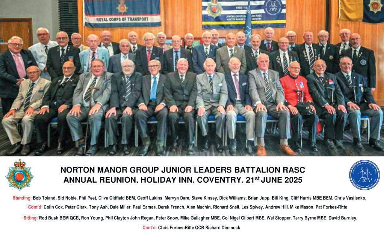 I attended the Norton Manor Group Junior Leaders Battalion RASC Annual Reunion on 21st June in Coventry, organised by Mike Mason. It was a great occasion, with much laughter, including being invited to replace RASC pocket badges with RCT and RAOC badges on two volunteers.