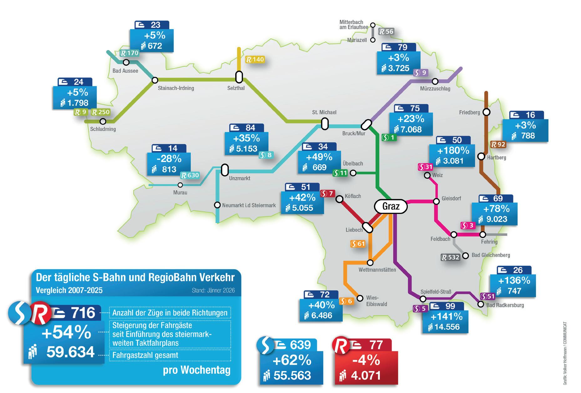 Besonders erfreulich entwickeln sich jene Strecken, die zuletzt eine Attraktivierung des Fahrplans erfahren haben. Auf der „alten“ S5 (verkehrte bis Dezember 2025 zwischen Graz und Spielfeld-Straß) werden bereits täglich über 14.500 Fahrgäste gezählt. Auch die S31 Weizer Bahn verzeichnet starke Zuwächse: Die Verlängerung durch das Weizer Stadtzentrum in den Norden samt dortiger Freifahrt zeigt volle Wirkung. Mit über 3.000 Einsteigern hat sich die Frequenz seit dem S-Bahn-Start mehr als verdoppelt, allein im Vorjahr waren 27 Prozent mehr Fahrgäste unterwegs.