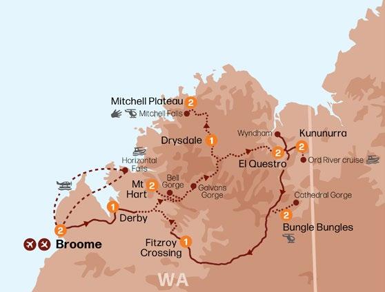 Tour Highlights: Visit the Horizontal Falls by seaplane with exciting boat ride, Explore the Mitchell Plateau and spend 2 nights at our luxury safari camp, Enjoy a guided walk to Mitchell Falls via rarely seen Gwion and Wanjina cultural art sites. Includes return scenic heli flight, Visit the Bungle Bungles including Cathedral Gorge and Echidna Chasm, Visit spectacular Windjana Gorge and Tunnel Creek National Parks, Enjoy an Ord River adventure cruise and learn about the Irrigation Scheme, Travel the infamous Gibb River Road and visit Bell and Galvans Gorge, Discover Kununurra and Wyndham including Five Rivers Lookout & Spend 2 nights at the iconic El Questro Wilderness Park and explore Chamberlain Gorge, Emma Gorge and Zebedee Springs