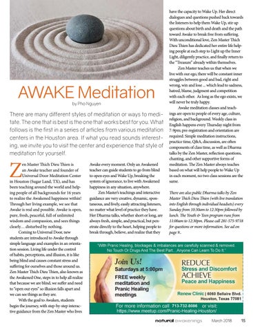 have the capacity to Wake Up. Her direct dialogues and questions pushed back towards the listeners to help them Wake Up, stir up questions about birth and death and the path toward Awake to break free from suffering. With unconditional love, Zen Master Thich Dieu Thien has dedicated her entire life helping people at each step to Light up the Inner Light, diligently practice, and finally return to the “Treasure” already within themselves. Zen Master teaches us that when we live with our ego, there will be constant inner struggles between good and bad, right and wrong, win and lose ... which lead to sadness, hatred, blame, judgment and competition with each other. As long as the ego exists, we will never be truly happy. Awake meditation classes and teachings are open to people of every age, culture, religion, and background. Weekly class in English happens every Thursday night from 7-9pm; pre-registration and orientation are required. Simple meditation instructions, practice time, Q&A, discussion, are often components of class time, as well as Dharma talks by the Zen Master, reflection questions, chanting, and other supportive forms of meditation. The Zen Master always teaches based on what will help people to Wake Up in each moment, no two class sessions are the same. There are also public Dharma talks by Zen Master Thich Dieu Thien (with live translation into English through individual headsets) every Sunday from 10:30am to 12:30pm followed by lunch. The Youth & Teen program runs from 11:00am to 12:30pm. Please call 281-575-9718 for questions or more information. See ad on page 9..