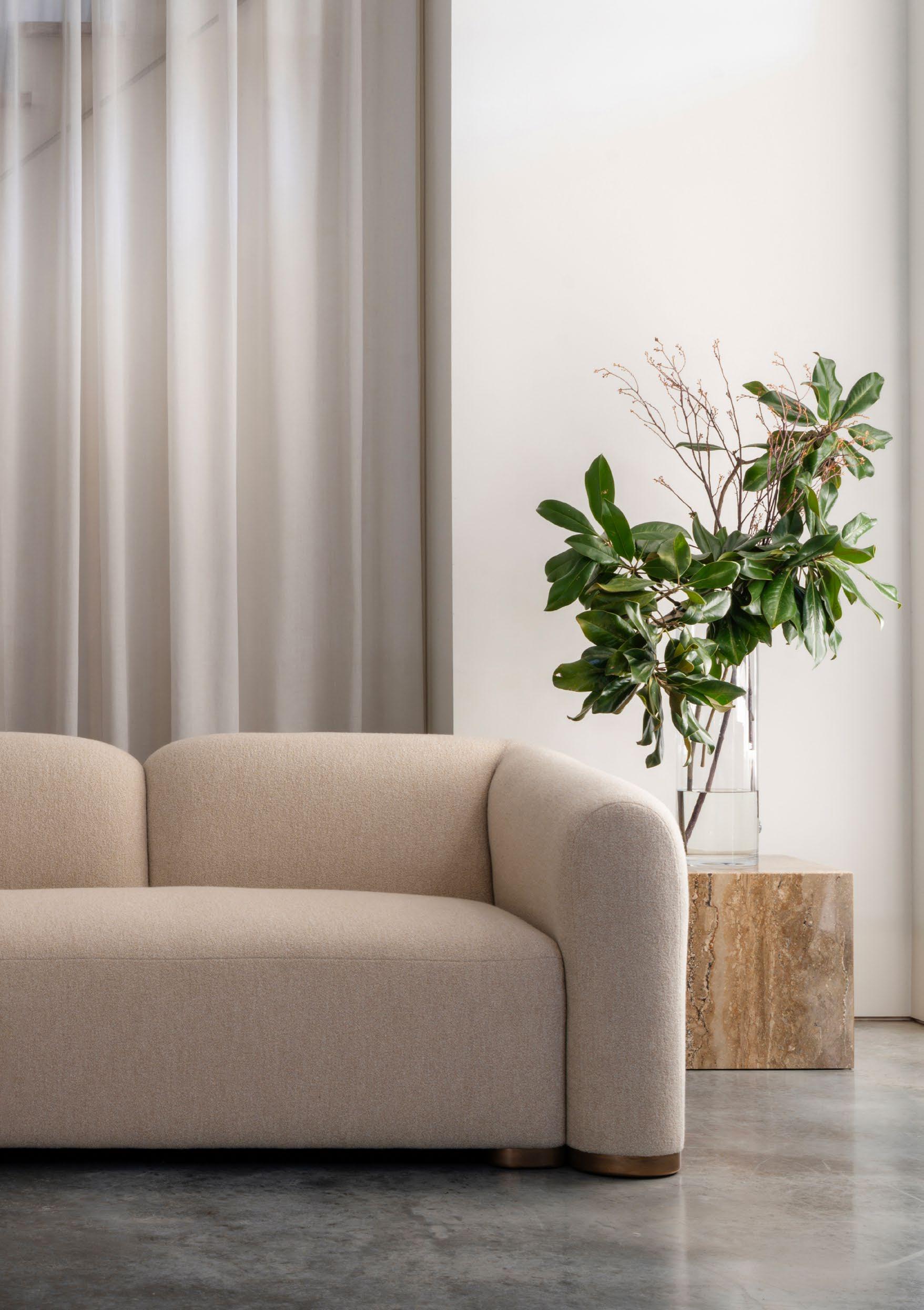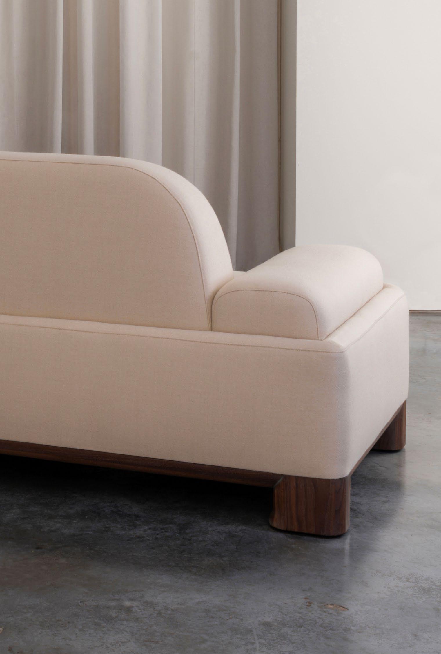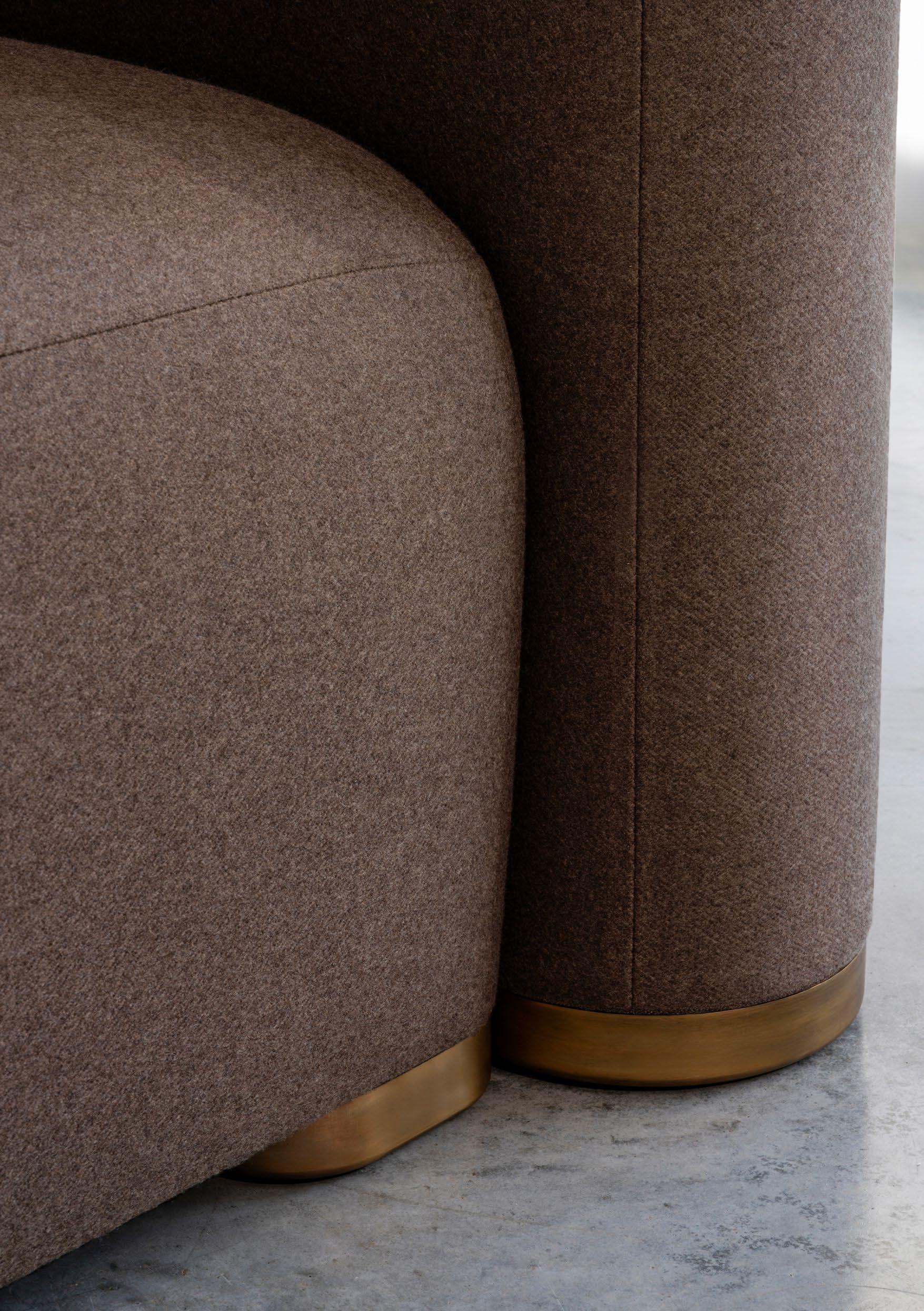 This contemporary tight seat sofa has an asymmetrical design that fits well in modern and eclectic interiors. Legs are available in solid wood or bronze. Upholstered in Bespoke Twill - Milliner Brown and Brunswick - Buff by Holland & Sherry.