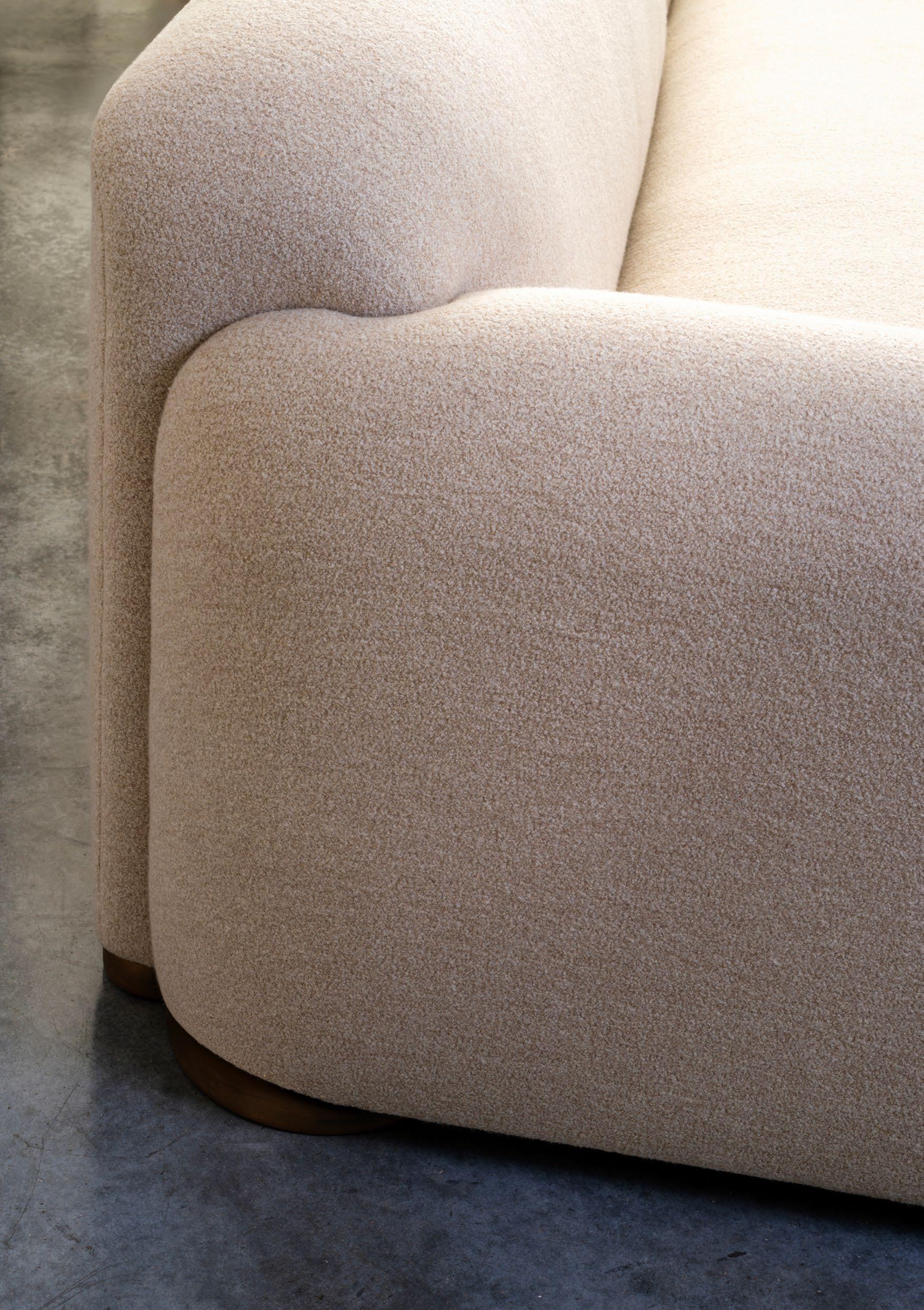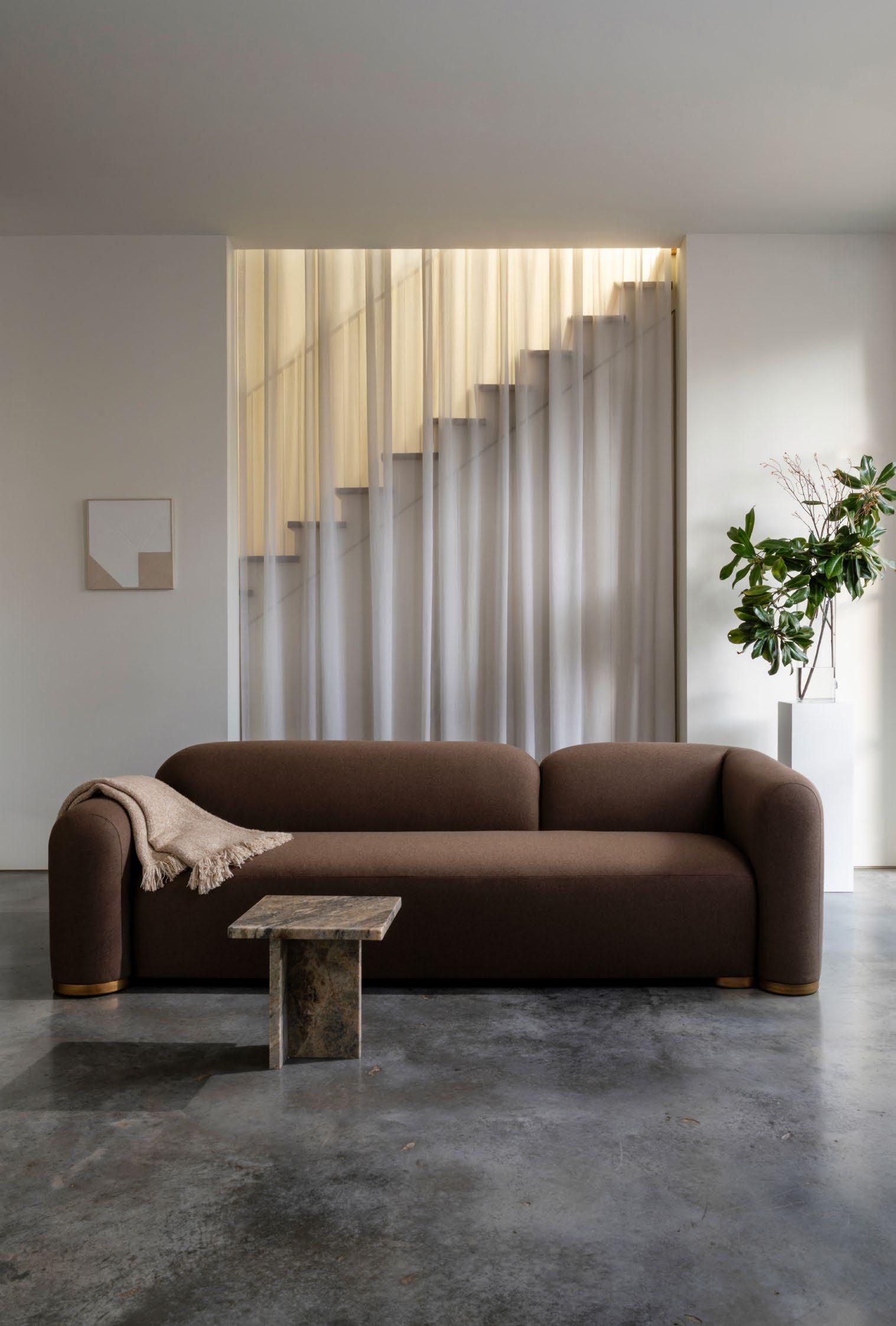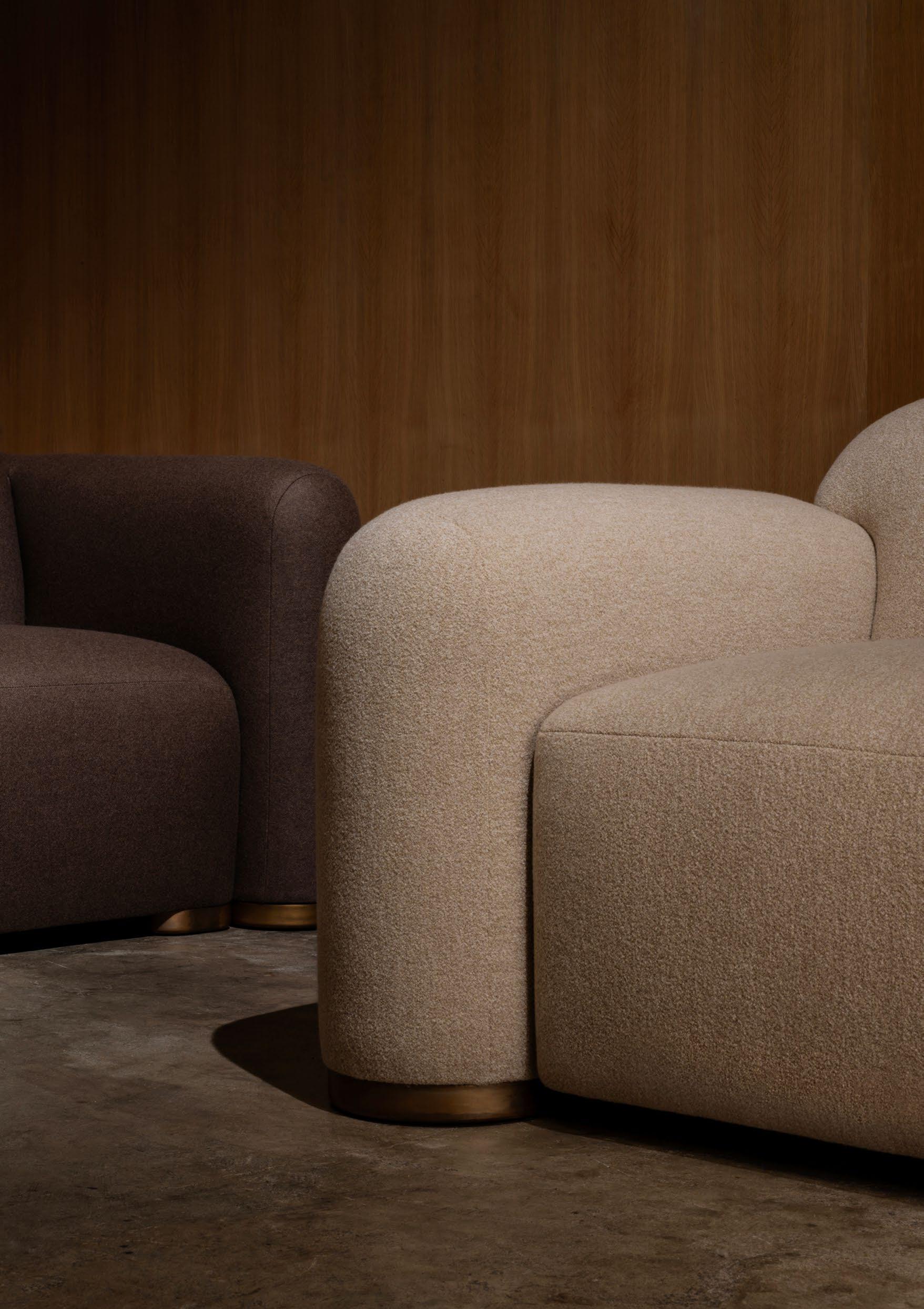 This contemporary tight seat sofa has an asymmetrical design that fits well in modern and eclectic interiors. Legs are available in solid wood or bronze. Upholstered in Bespoke Twill - Milliner Brown and Brunswick - Buff by Holland & Sherry.