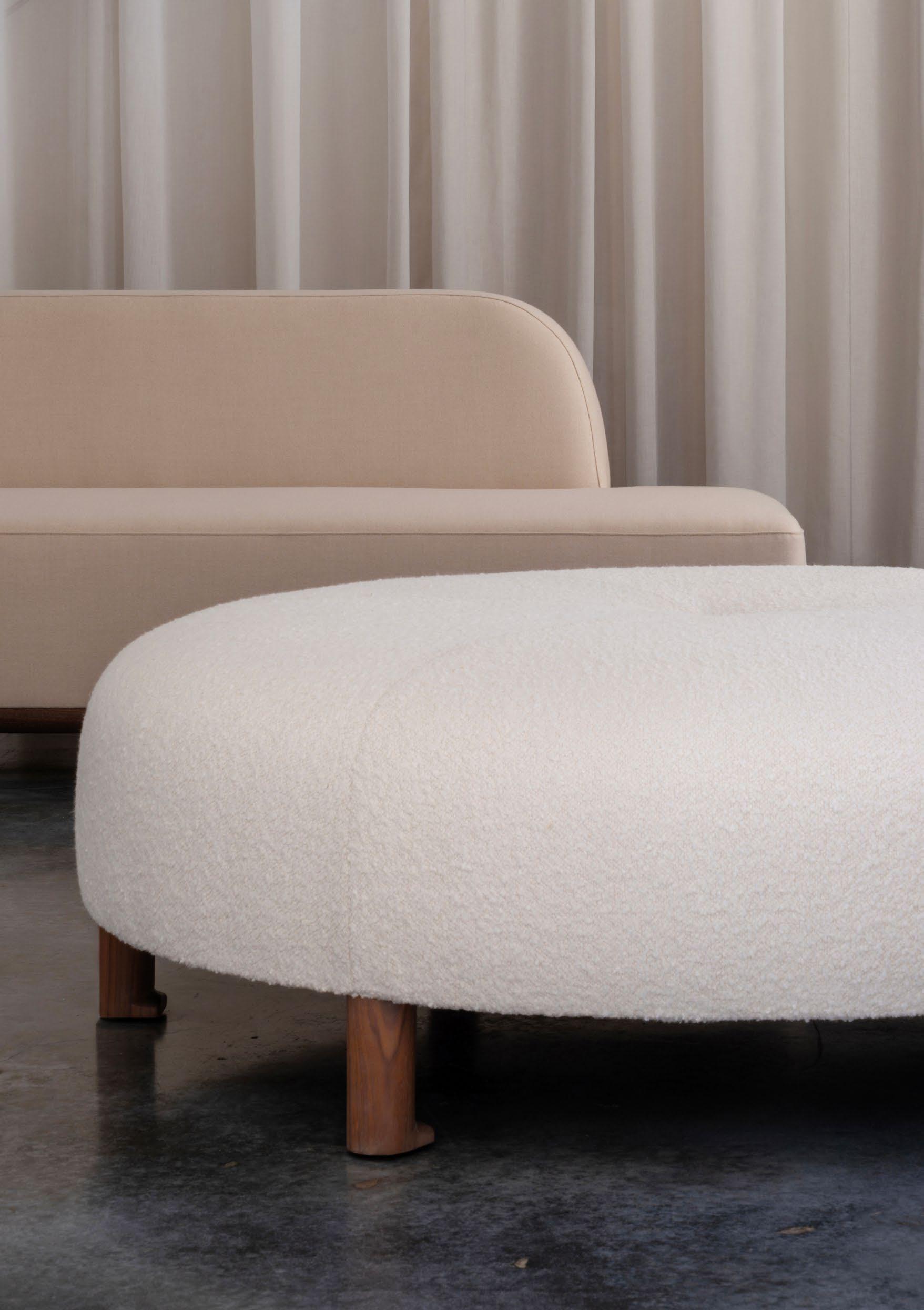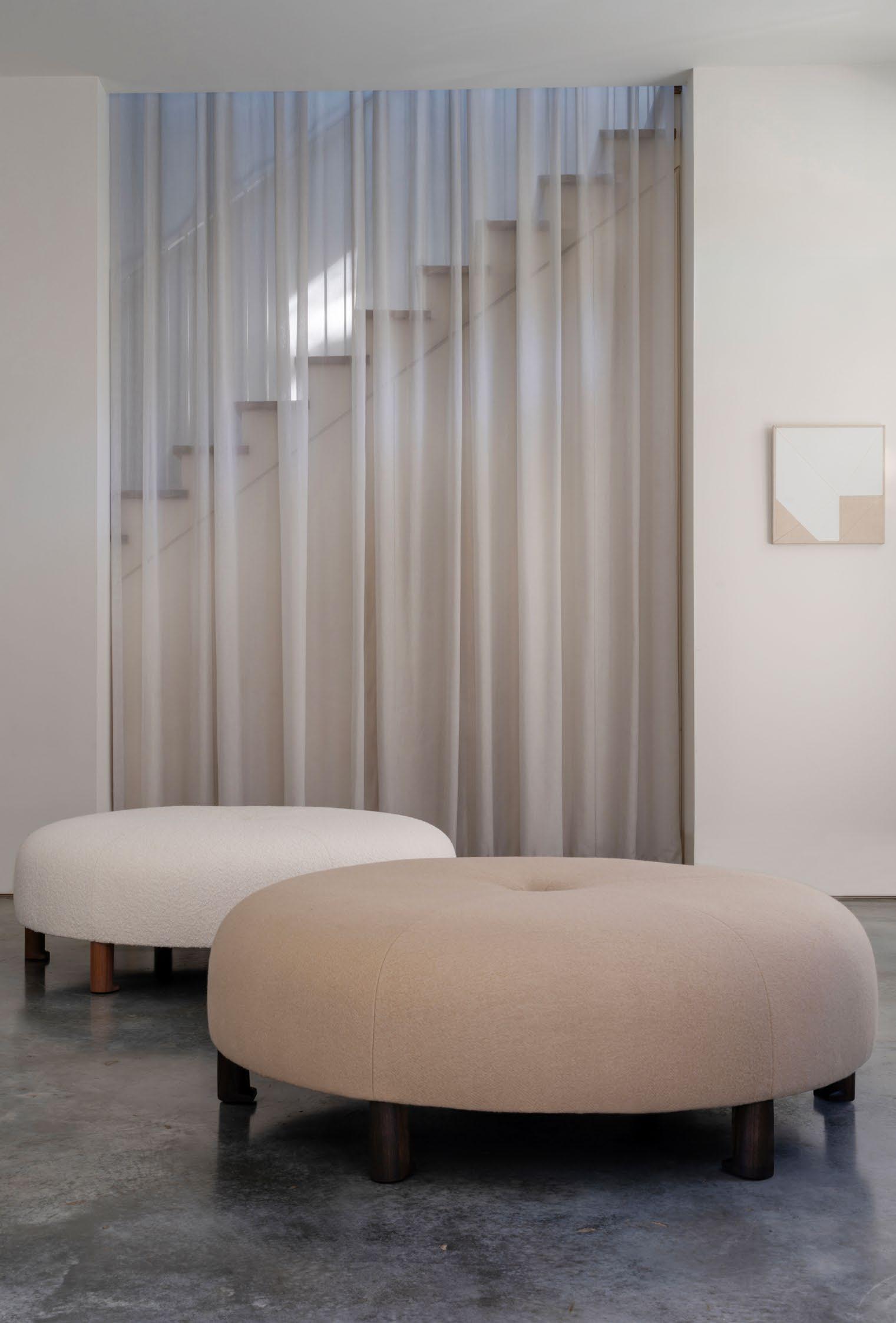 Six-legged round ottoman with an inward facing "foot" motif on each leg. The upholstered top is comprised of six wedge-shaped fabric panels that are seamed together to receive a center "blind" (buttonless) tuft. Upholstered in Melissani - White and Varsity Flannel - Tan by Holland & Sherry.