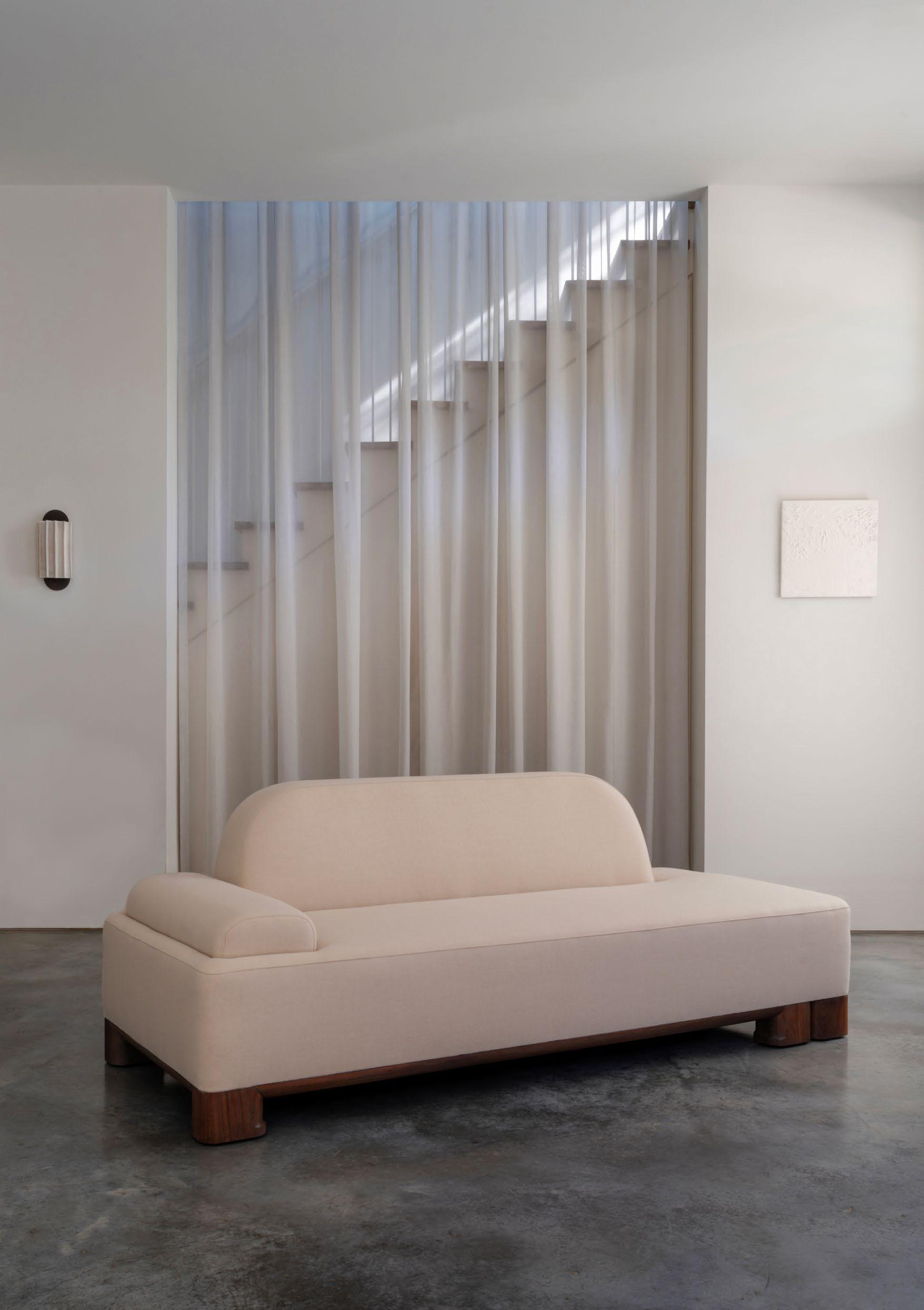 A daybed/sofa that incorporates novel engineering allowing for the upholstered back and armrest to rise from the seat's single panel crown. The asymmetrical wood base has a filleted edge apron and oversized legs which include inward facing “toes”. Upholstered in Bespoke Twill - Sachet by Holland & Sherry.