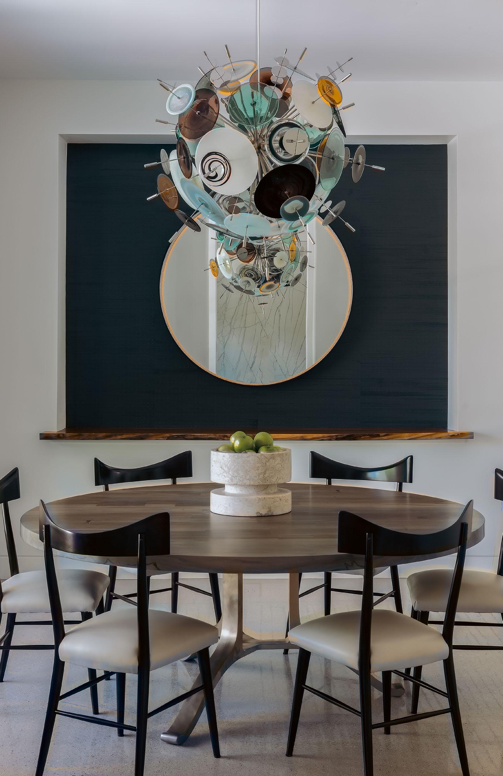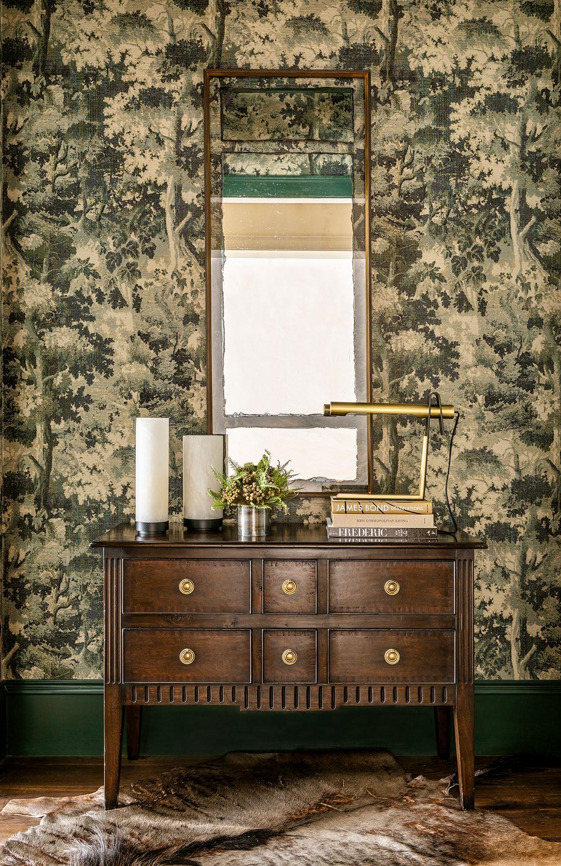 The vision for the wallpaper was to establish a striking backdrop within the dining niche. Its depth creates a sense of intimacy, while providing contrast that highlights the sculptural chandelier and circular mirror as focal points. By grounding the space and balancing the room’s lighter tones, the wallpaper introduces a refined sense of artistry and visual impact.