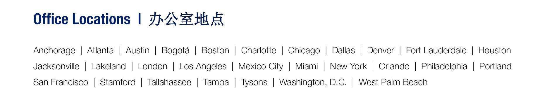 霍兰德奈特律师事务所是一家位于美国的全球性法律事务所,我们致力于向客户提供高质量的法律 服务。我们向在美国及拉丁美洲进行商业活动或投资的中国投资人及公司提供他们所需的各类法律 协助。我们也向跨国公司、金融机构、贸易机构、投资人及其他客户提供他们于其与中国相关活动 中所需的咨询和协助。我们在 28 个办公室的 1300 多名对各领域有经验的律师及专业人员能够协助客 户处理他们在经营或投资过程中所遇到的各种机会及挑战。