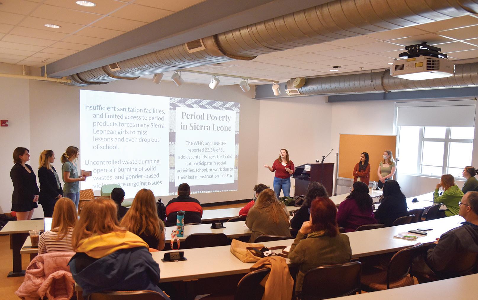 Assistant Professor of Gender and Women’s Studies Lindsey Breitwieser (standing at podium) presents at the 2024 Leading Equity, Diversity, and Justice Conference in February. The students standing with her were involved in HAPPI and researched issues around period poverty in Sierra Leone.
