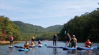 LEFT: Wellington (fourth from left, standing) with her professors and classmates on their January Short Term trip to Ecuador, led annually by Director and Chair of Environmental Studies Renee Godard. RIGHT: In preparation for the Ecuador trip, Godard took students to Carvins Cove last fall for stand-up paddle boarding and team building activities.