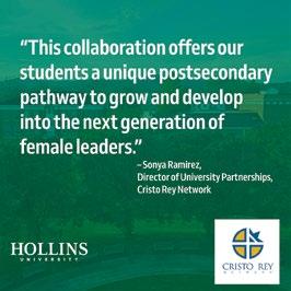 Rooted in a shared vision for student success, the collaboration will increase college match, access, persistence, and graduation rates among Cristo Rey students and alumnae. Through Hollins’ comprehensive support system, staff resources, and Cristo Rey’s alumni support teams, Cristo Rey students enrolled at Hollins will benefit from a seamless transition and continued success from enrollment through graduation. Hollins will offer competitive financial aid packaging to five to 10 Cristo Rey students, including an annual award that meets no less than 100% of student’s demonstrated need with no required loans for tuition, fees, and on-campus food and housing, ensuring that financial barriers do not hinder student success.