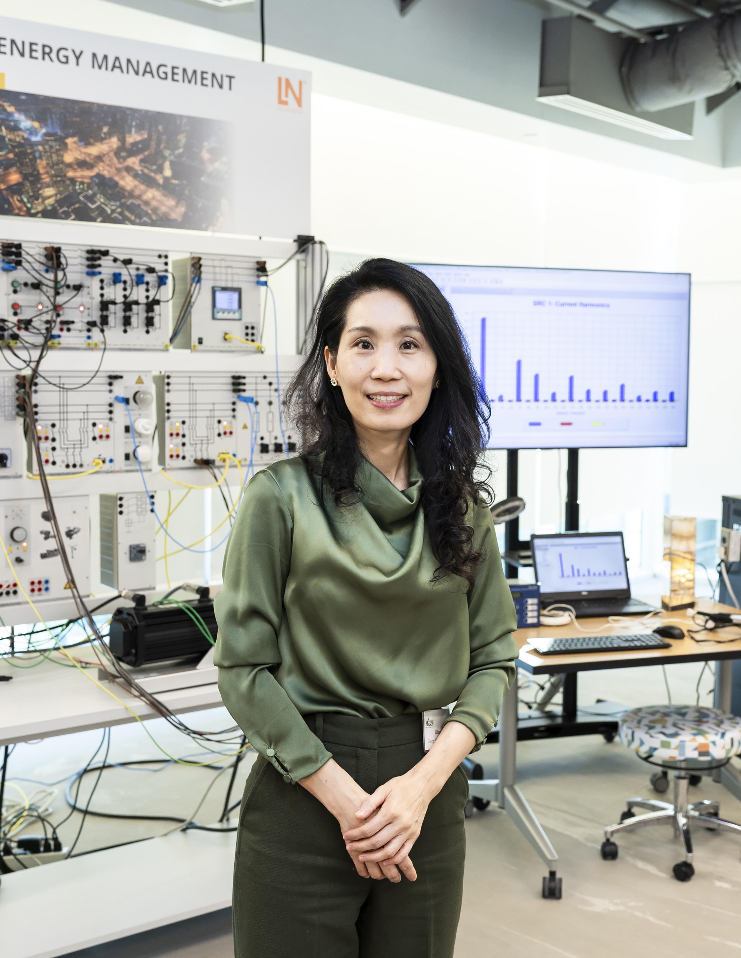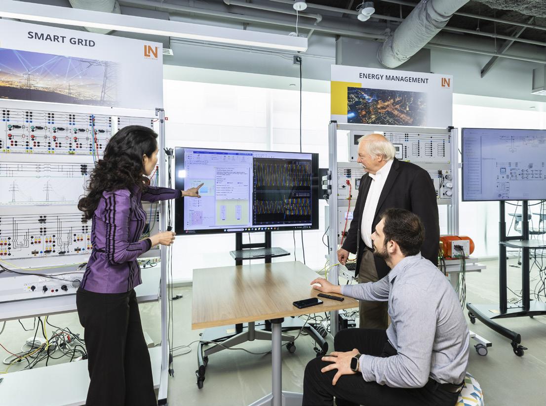 The lab is being used for teaching and research and hosts events and demonstrations, including one for the university’s President’s Innovative Advisory Committee. In April, the Schar School of Policy and Government cohosted the National Capital Area Chapter of the United States Association for Energy Economics North American Conference. The daylong seminar’s theme was, “Ensuring Reliability: The Right Energy in the Right Places at the Right Times.” Liling Huang, who directs the lab and is an associate professor in ECE and Dominion Energy Faculty Fellow, presented on the lab’s ability to enable students and researchers to conduct various hands-on experiments, work with hardware-in-theLoop (HIL) simulations, and analyze simulation data related to power and energy systems.
