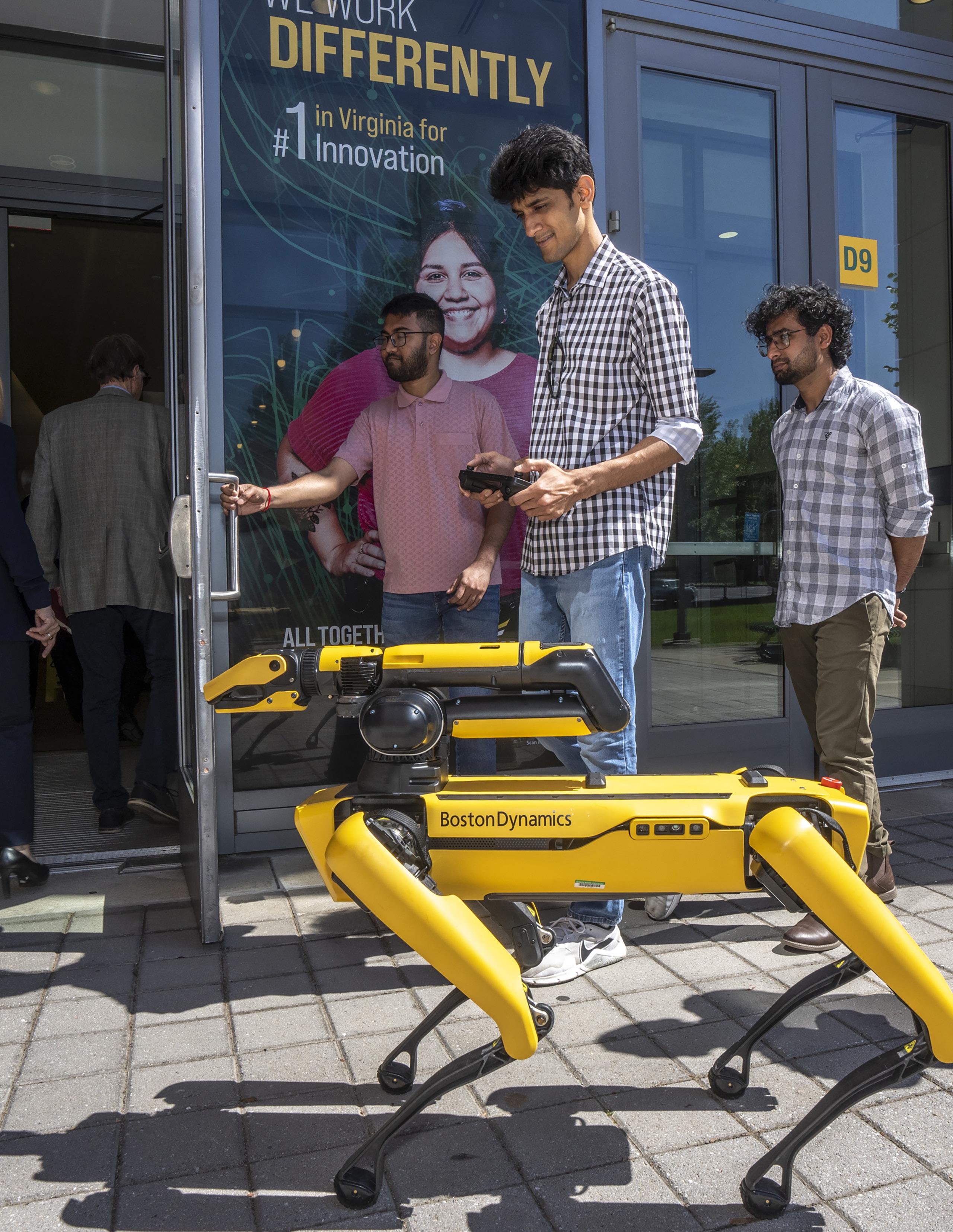 Industry executives, campus leaders, faculty, donors, and alumni attended the official opening of the CEC’s Mason Autonomy and Robotics Center (MARC), but the star of the show was a Boston Dynamics quadruped. As the bright yellow doglike robot held one end of the green ribbon, George Mason President Gregory Washington, MARC co-directors Professors Missy Cummings and Jesse Kirkpatrick cut the ribbon. Afterward, the quadruped roamed the event, opening doors for attendees and demonstrating its capabilities.