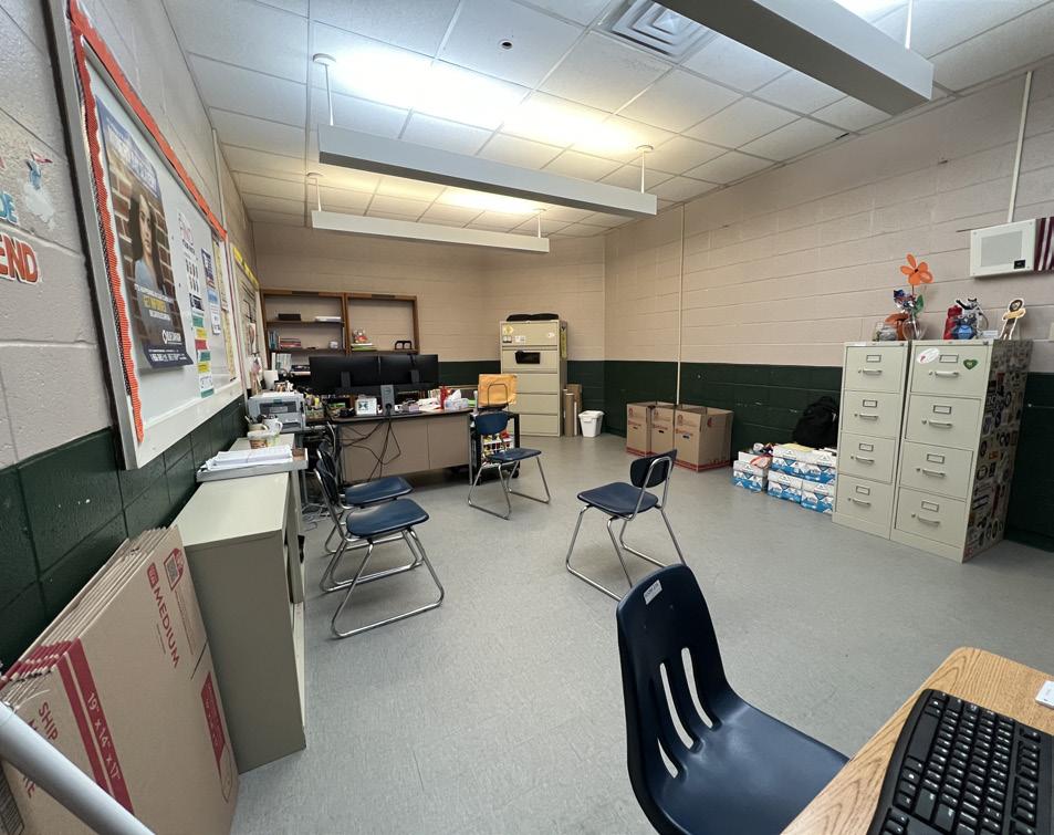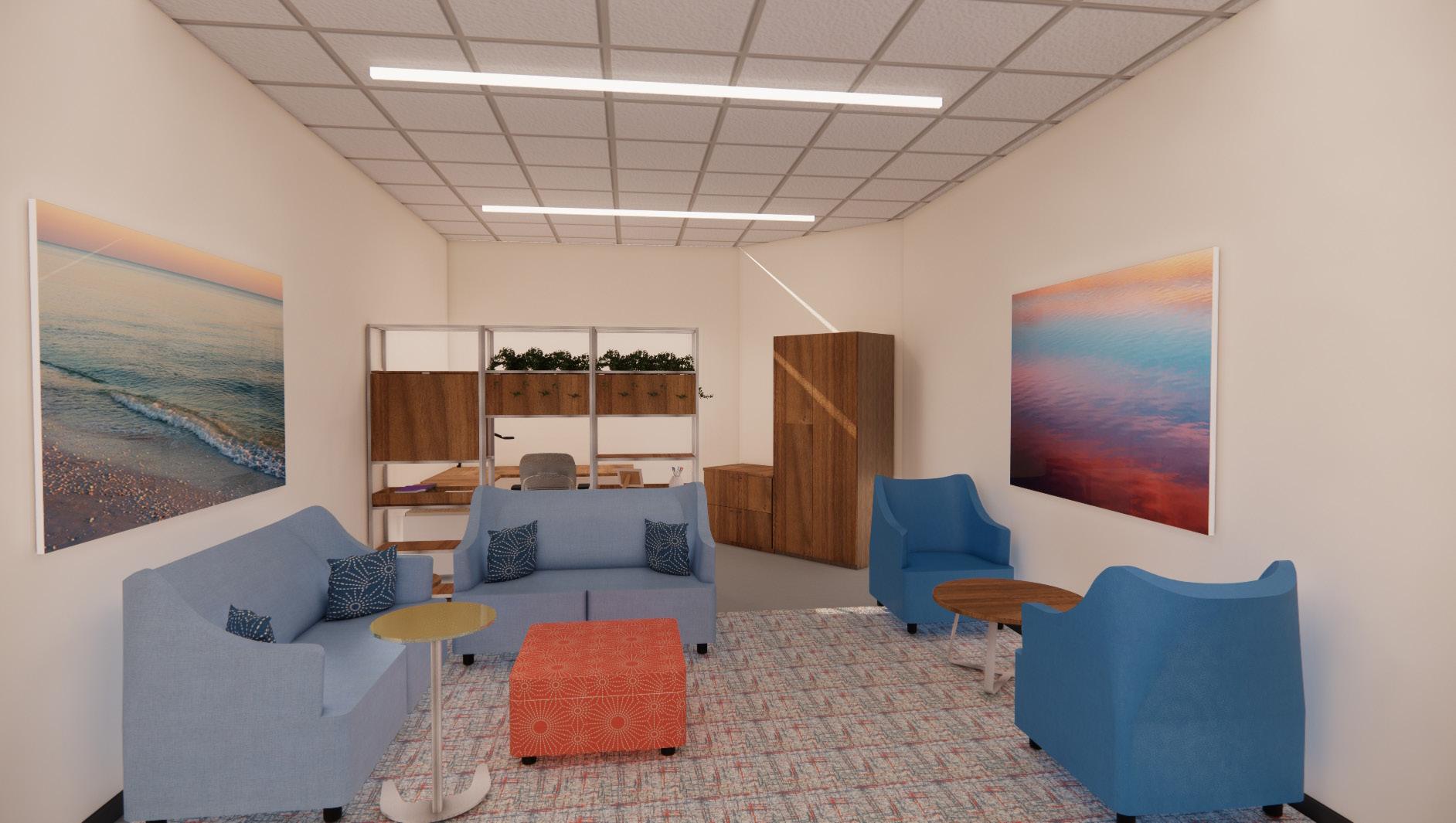 H/S was tasked with creating a calming room at a local high school. Below is an example of the existing room being converted into a calming room. The use of cool colors, soft textures, acoustical dampening, and natural imagery invokes a sense of peace.